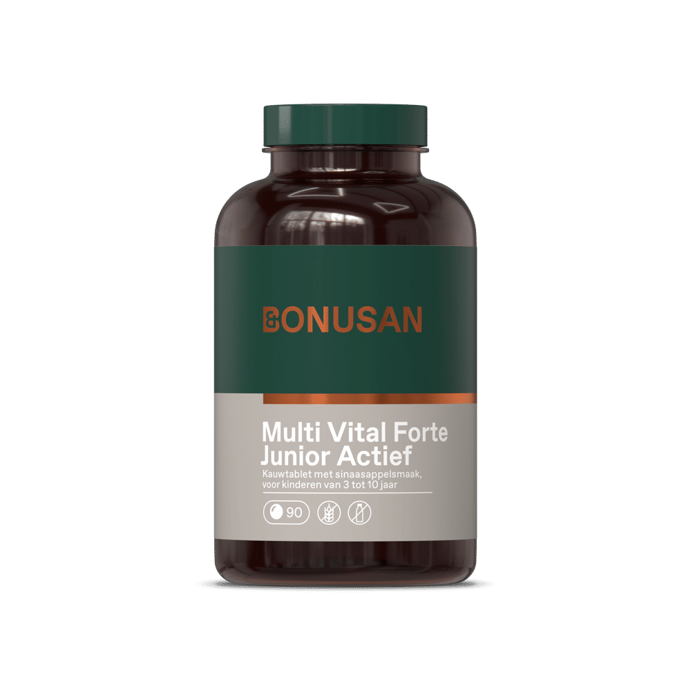 Multi Vital Forte Junior Actief is een multivitamine speciaal voor kinderen. Deze multi in de vorm van een kauwtablet zit vol vitaminen, mineralen en andere micronutriënten in goed opneembare vorm. Dé aanvulling op een gezond eetpatroon voor ieder kind.
