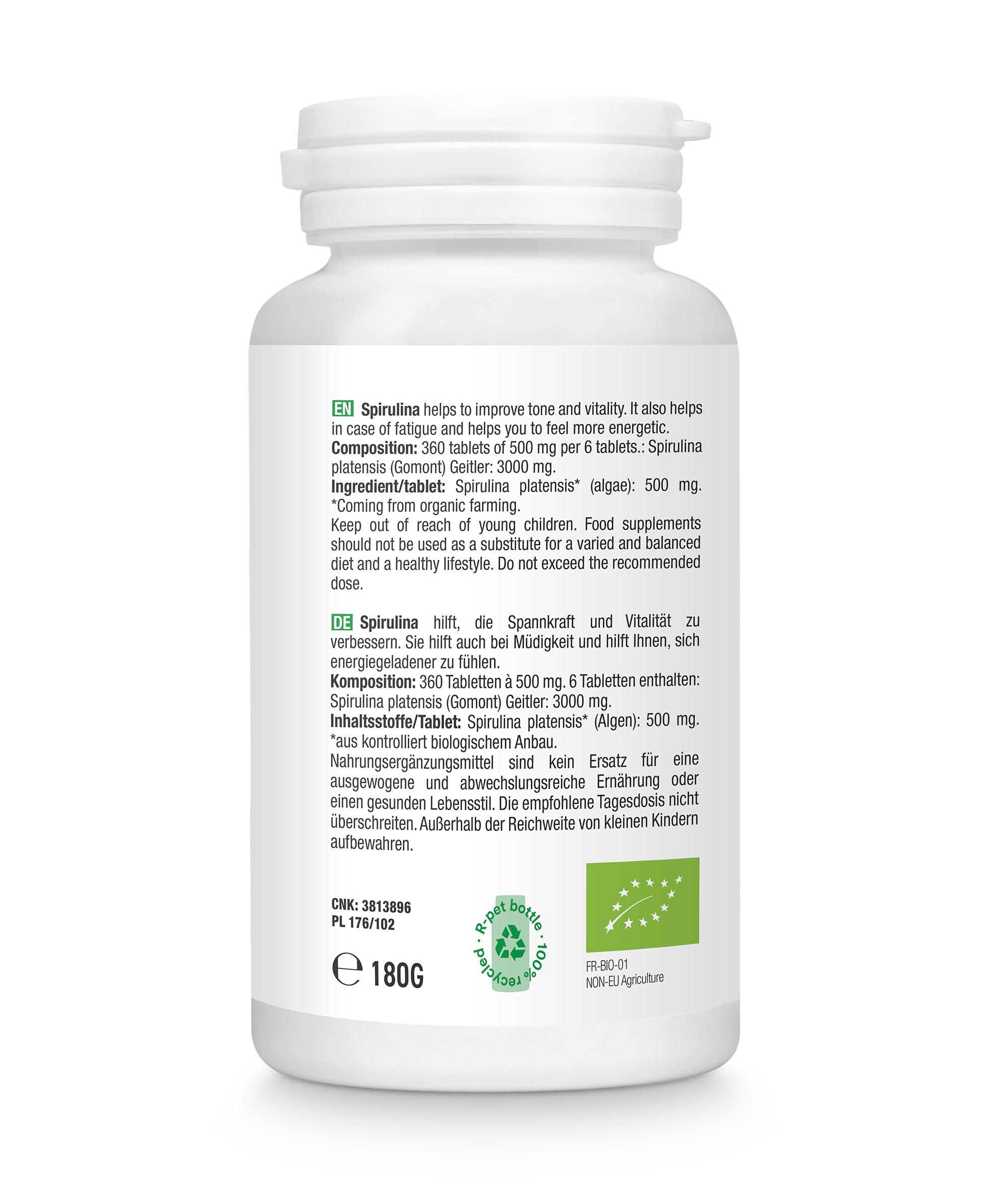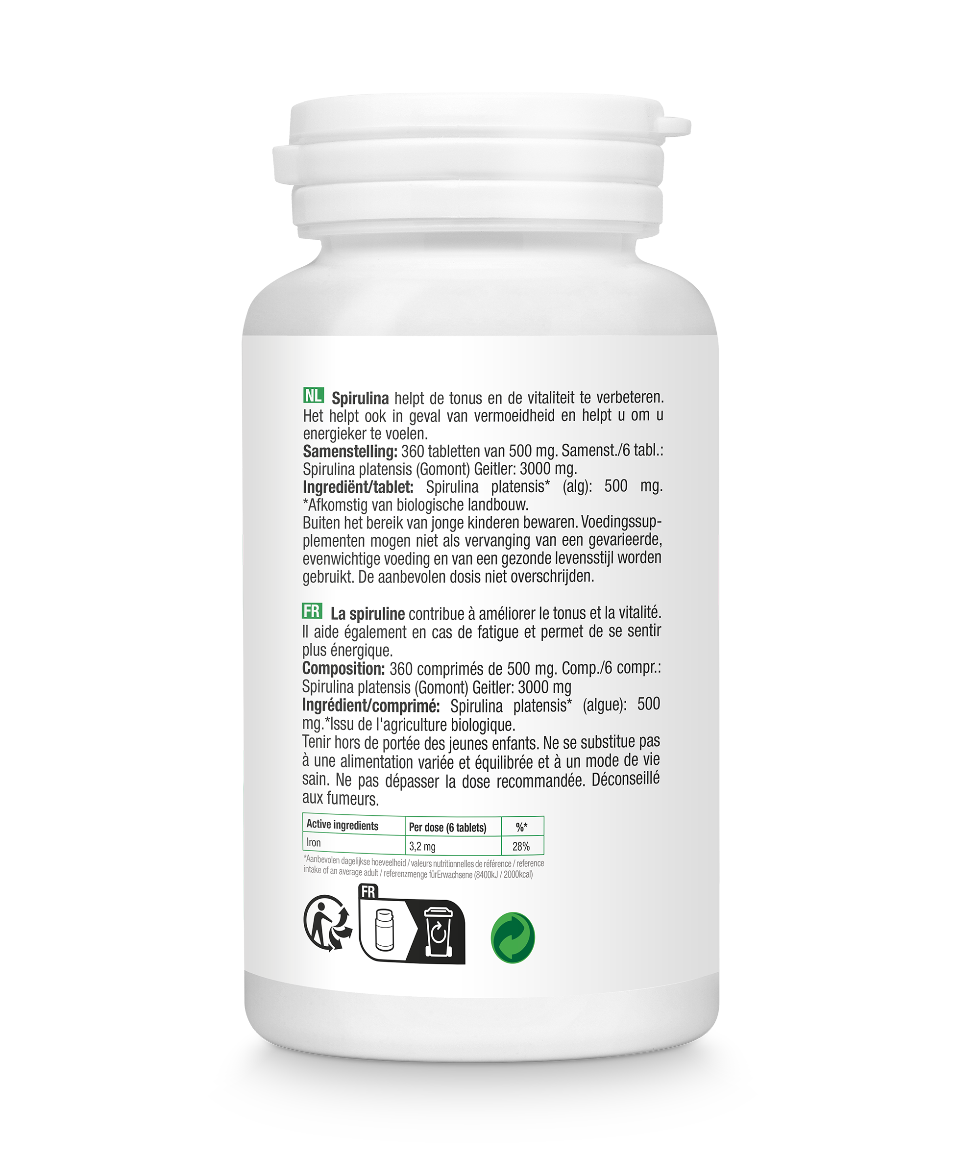 Spirulina is een microscopische zoutwateralg die behoort tot de cyanobacteriën (blauwalgen). De blauwgroene spirulina bevat een grote reeks aan essentiële voedingsstoffen voor ons lichaam. Niet alleen bevat het meer dan 60% compleet eiwit (bijna driemaal zoveel als rundvlees!), het bevat veel andere belangrijke vitaminen en mineralen, zoals vitamine B-complex, vitamine E, carotenoïden, ijzer, mangaan, zink, essentiële vetzuren, zoals gamma-linoleenzuur en veel bètacaroteen.
