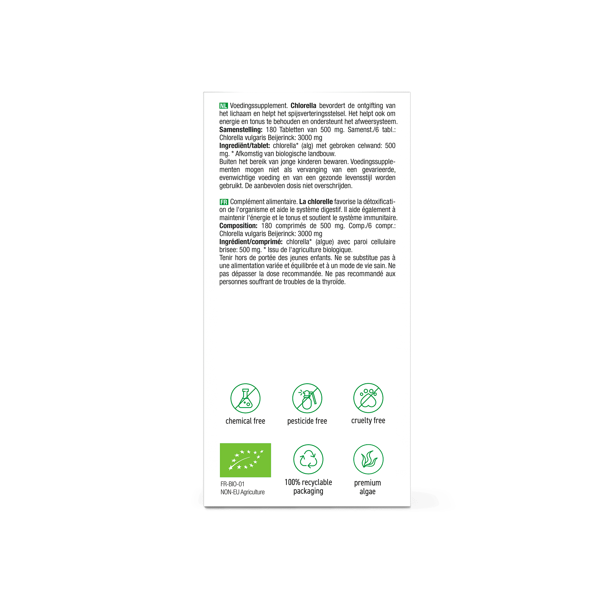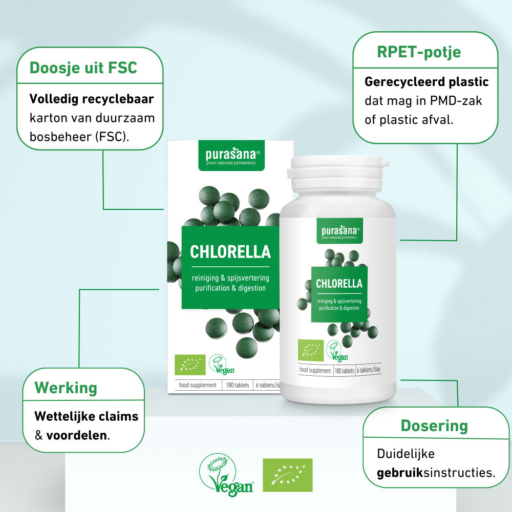 Chlorella is een zoetwateralg en één van de meest volwaardige voedingsbronnen ter wereld. Het bevat van nature diverse voedingsstoffen en fytonutriënten. Chlorella bevat het hoogste gehalte chlorofyl (bladgroen) van alle planten op aarde.