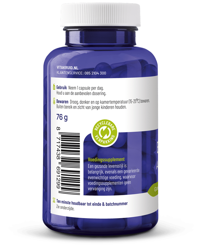 Een gevarieerde, evenwichtige voeding en een gezonde levensstijl zijn belangrijk. Een voedingssupplement is geen vervanging van een gevarieerde voeding.