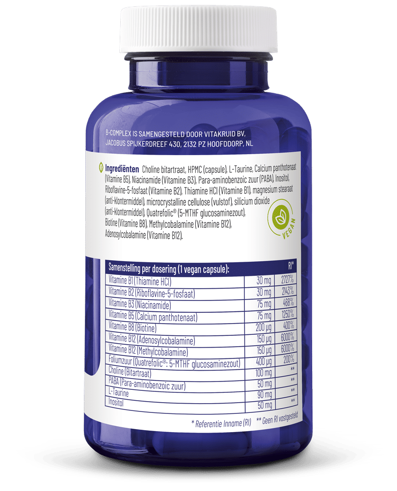 Mocht je toch geïnteresseerd zijn in een B-complex met vitamine B6 in de veilige vorm P-5-P, dan adviseren we je de Multi Dag, Multi Dag Vrouw of de Multi Dag Mama. Dit zijn hoogwaardige multivitaminen voor de dag, waarin tevens een volwaardig B-complex is opgenomen.