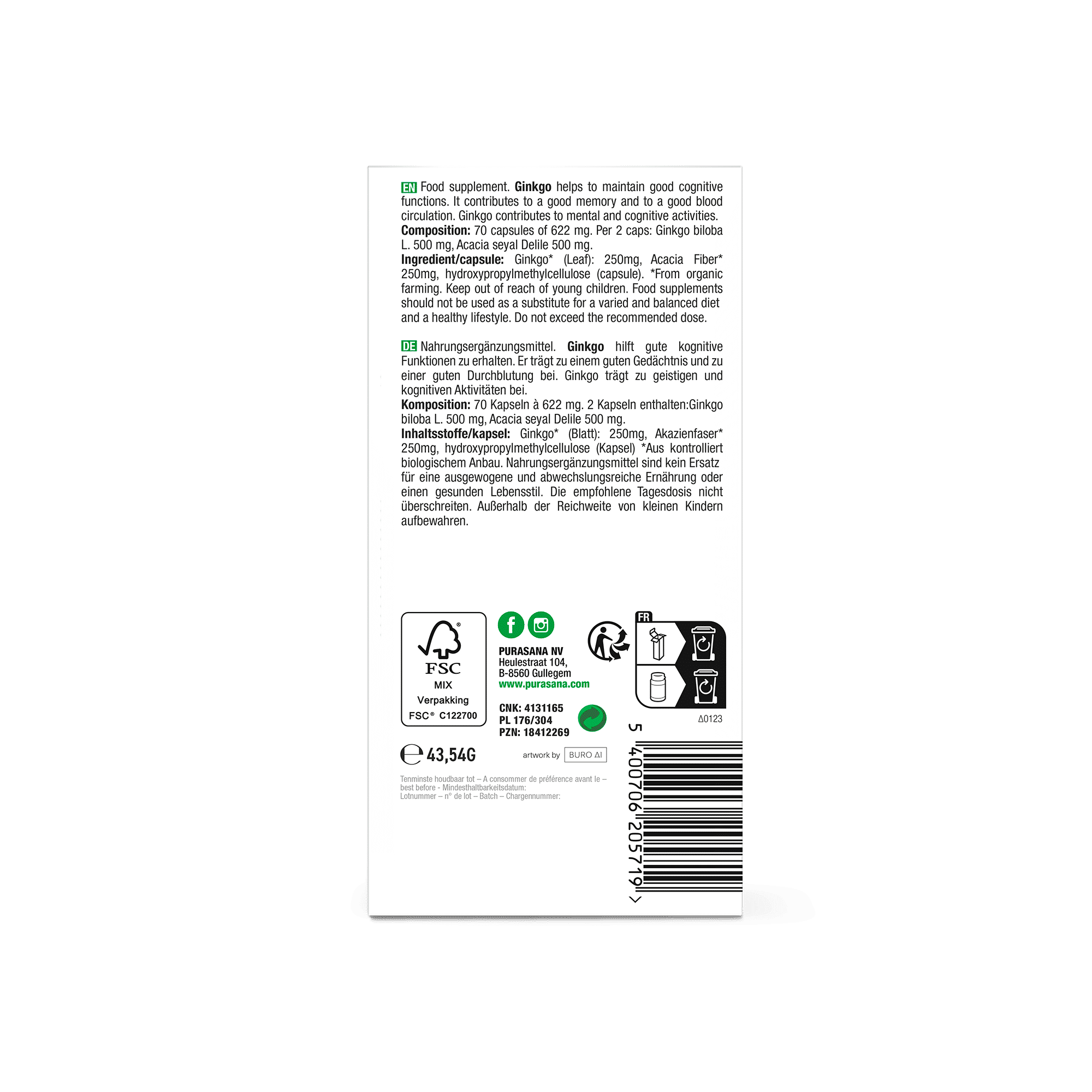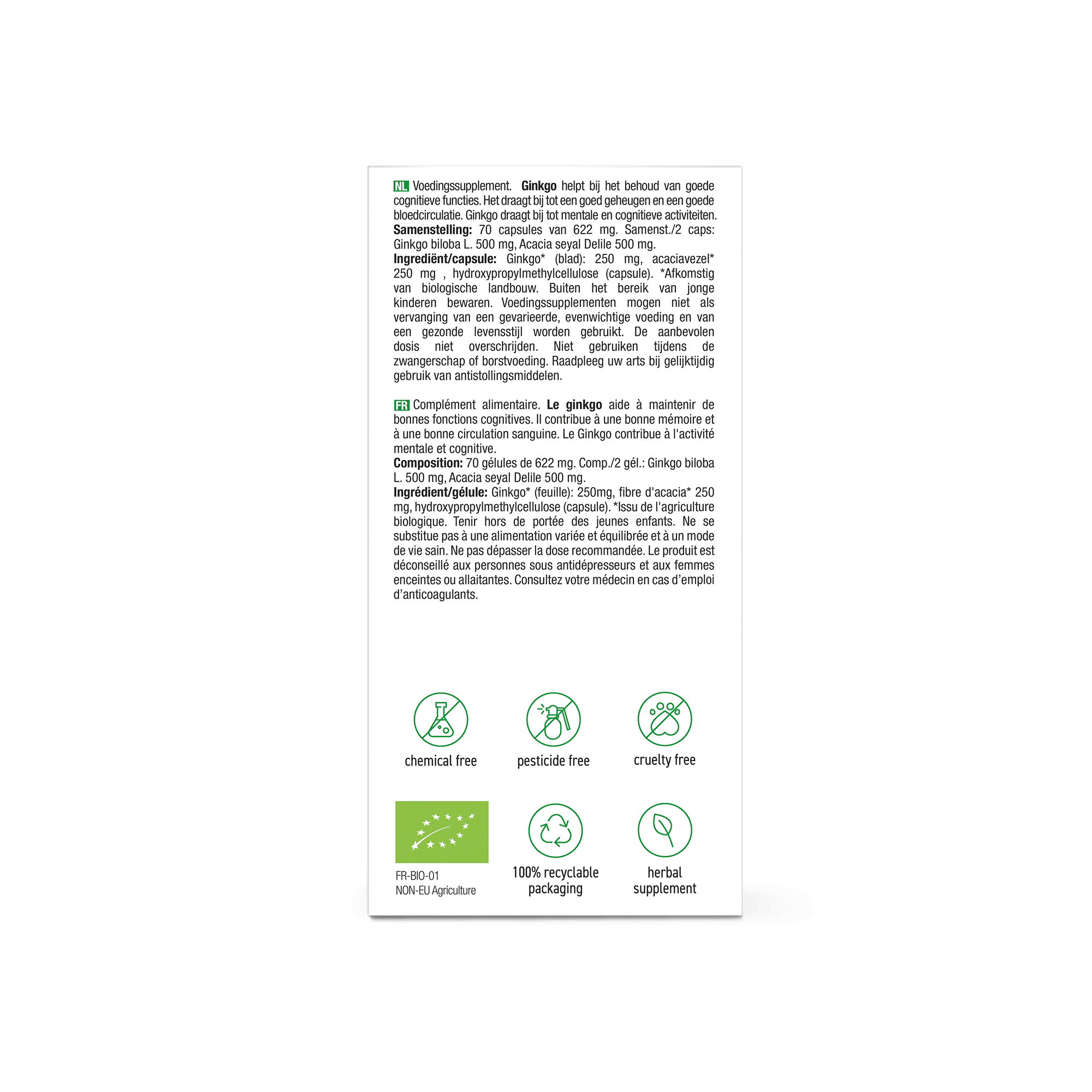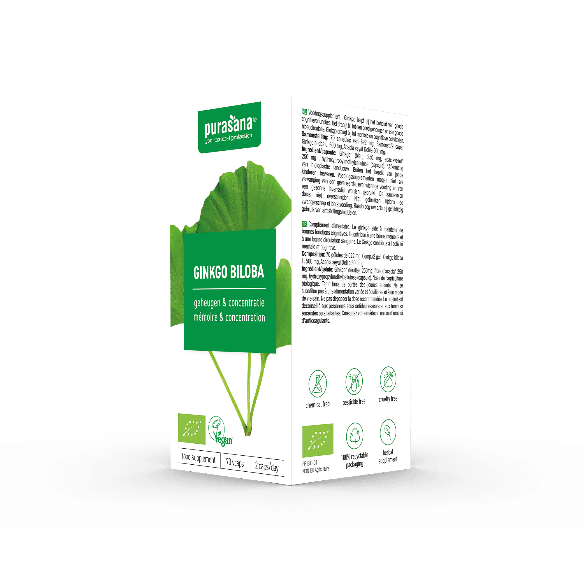 Ginkgo Biloba staat ook wel bekend als Japanse notenboom en komt oorspronkelijk uit China. Vooral de bladeren bevatten gezondheidsbevorderende stoffen. Daarom bevatten de capsules 100% natuurlijk extract van de bladeren van de Ginkgo Biloba.