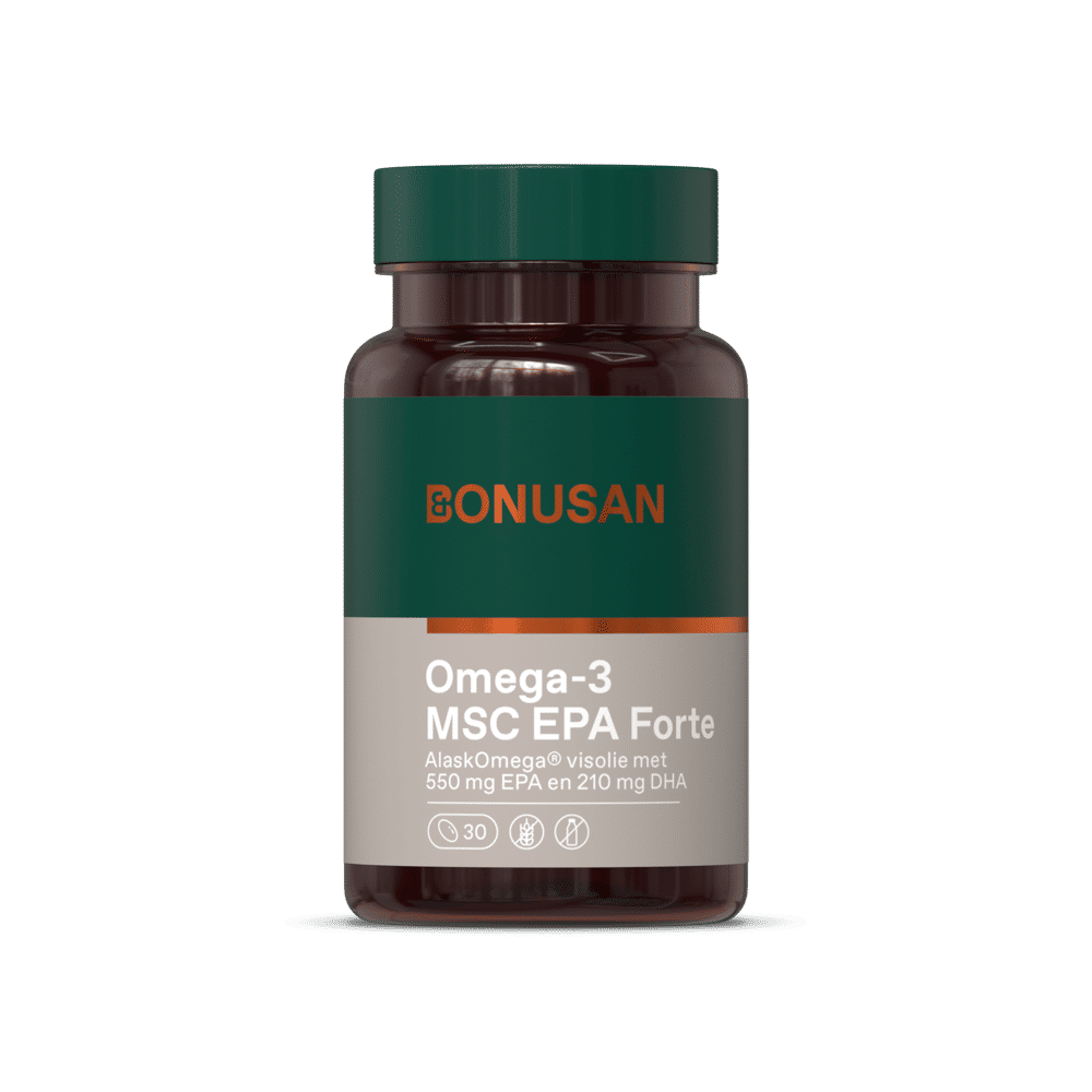 Omega-3 vetzuren, waar EPA deel van uitmaakt, zijn een groep met meervoudig onverzadigde vetzuren en belangrijke bouwstoffen voor het menselijk lichaam. EPA halen we uit onze voeding. Soms lukt het niet om voldoende EPA-rijke voeding te eten, of heeft ons lichaam moeite om EPA uit de andere omega-3 vetzuren om te zetten. In dat geval kan Bonusan Omega-3 MSC EPA Forte uitkomst bieden.