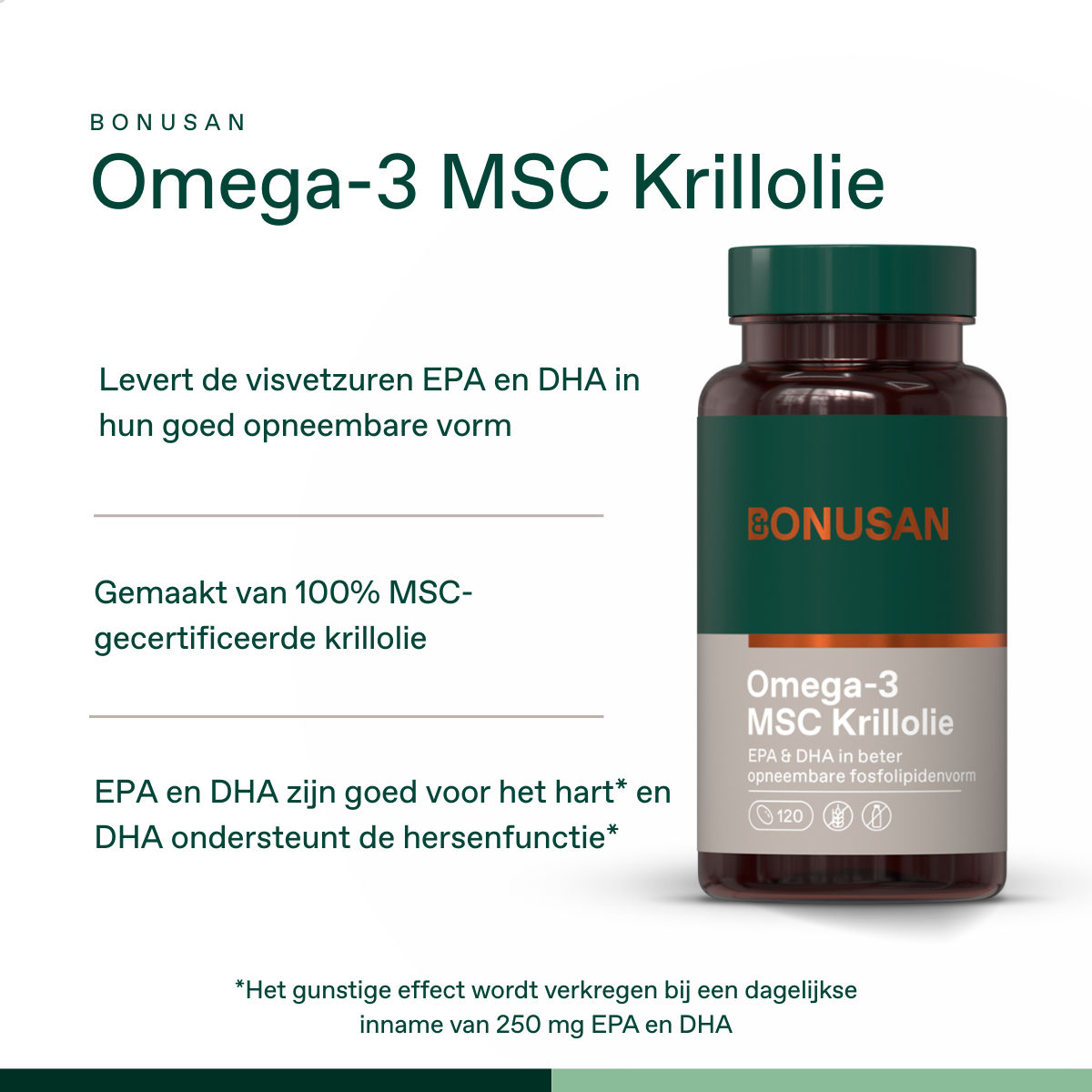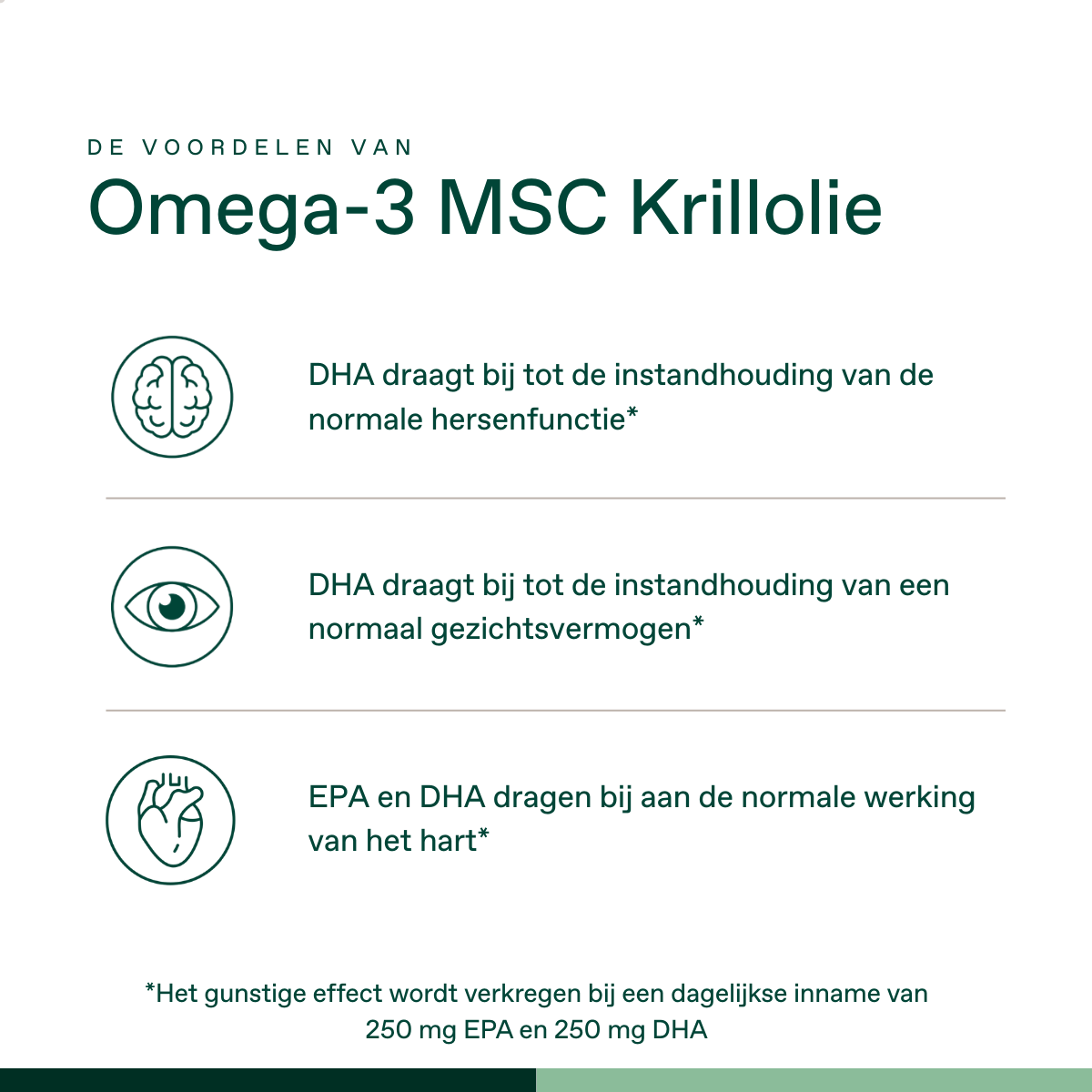 EPA en DHA zijn goed voor het hart. Dit gunstige effect wordt verkregen bij een dagelijkse inname van 250 mg EPA en DHA. DHA draagt bij tot de instandhouding van de normale hersenfunctie en een normaal gezichtsvermogen. Dit gunstige effect wordt verkregen bij een dagelijkse inname van 250 mg DHA.