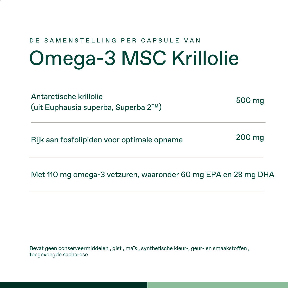 Krillolie (SCHAALDIEREN), capsulewand (VISgelatine, water, glycerine, sorbitol).