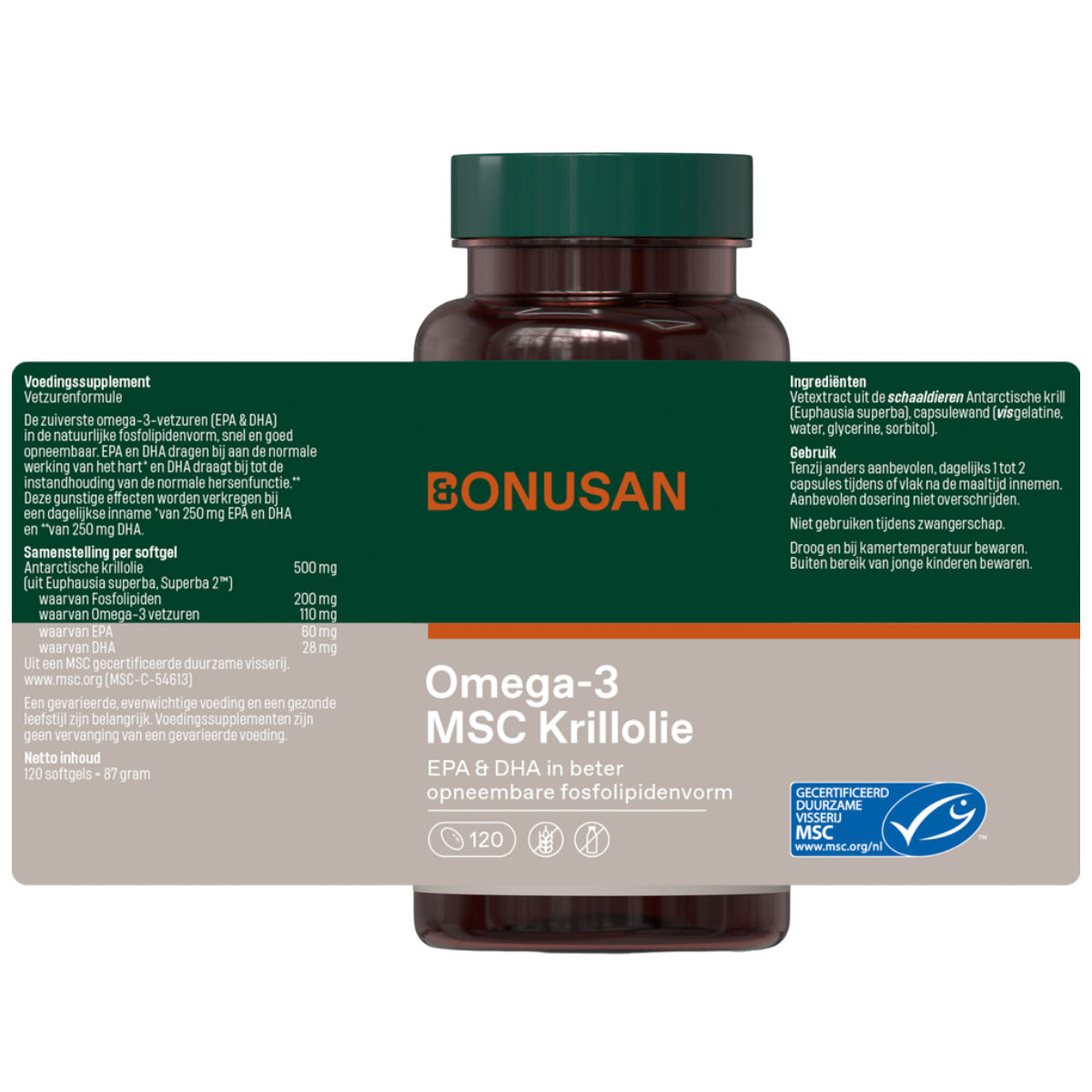 Bonusan Omega-3 MSC Krillolie is geproduceerd van vetzuren uit Arctische krill. Deze kleine garnaalachtige schaaldiertjes staan laag in de voedselketen en bieden daarom de schoonste vetzuren.