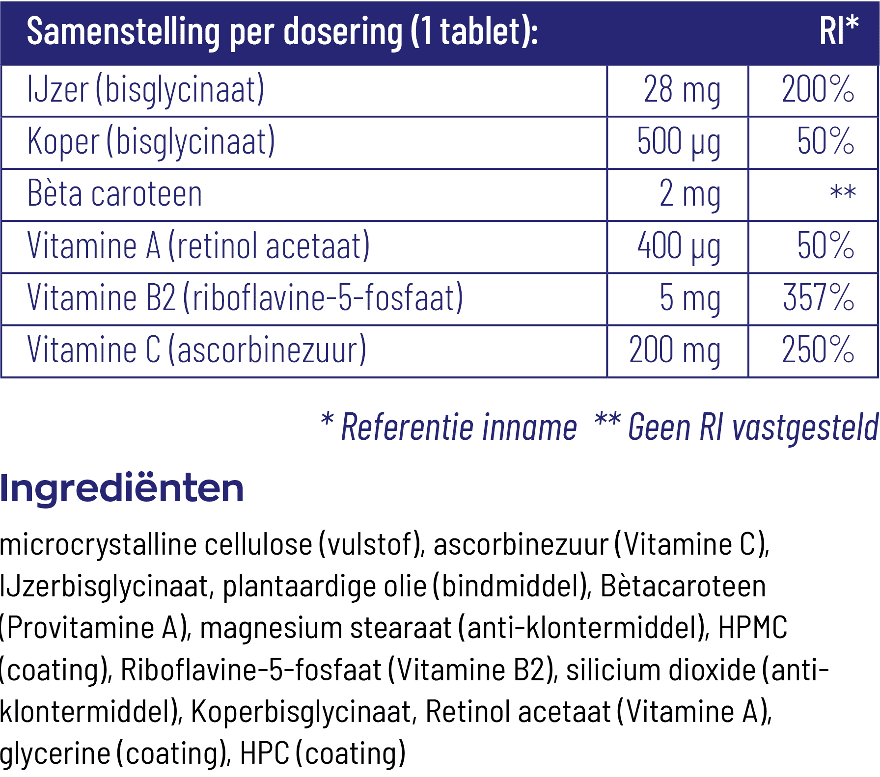 | IJzer (bisglycinaat) | 28 mg | 200% |