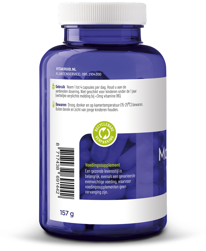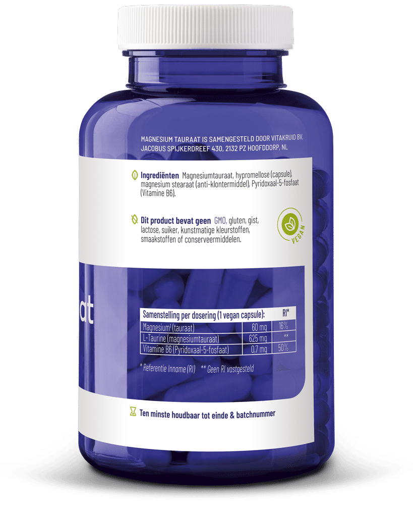 Magnesiumtauraat is een biologische beschikbare en organisch gebonden vorm van magnesium. Anorganisch magnesiumvormen zoals magnesiumchloride, magnesiumhydroxide en magnesiumsulfaat zijn minder biologisch beschikbaar en worden daardoor minder goed opgenomen. Zo heeft magnesiumsulfaat bijvoorbeeld maar een biologische beschikbaarheid van 4%. Dit betekent dat een dosering van 200 mg magnesiumsulfaat maar voor een luttele 8 mg effectief is. De beste vormen die we kennen zijn magnesiumchelaten zoals, magnesiumtauraat, magnesiummalaat en magnesiumbisglycinaat. Uw dagelijkse voeding bevat over het algemeen anorganisch gebonden magnesium. Dit zijn namelijk de vormen die in de bodem voorkomen en worden opgenomen door de planten die u dagelijks eet. Voorbeelden hiervan zijn magnesiumoxide en magnesiumcarbonaat. Uw lichaam neemt dus maar een klein deel op van de magnesium die u uit reguliere voeding binnenkrijgt. Magnesium Tauraat van Vitakruid is dus een toegevoegde waarde binnen uw voedingpatroon!