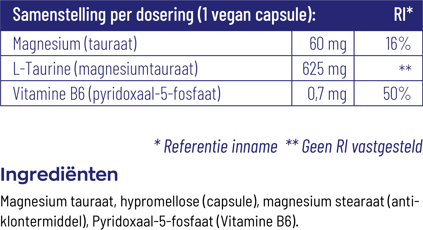 Magnesiumtauraat, hypromellose (capsule), magnesium stearaat (anti-klontermiddel), Pyridoxaal-5-fosfaat (Vitamine B6).