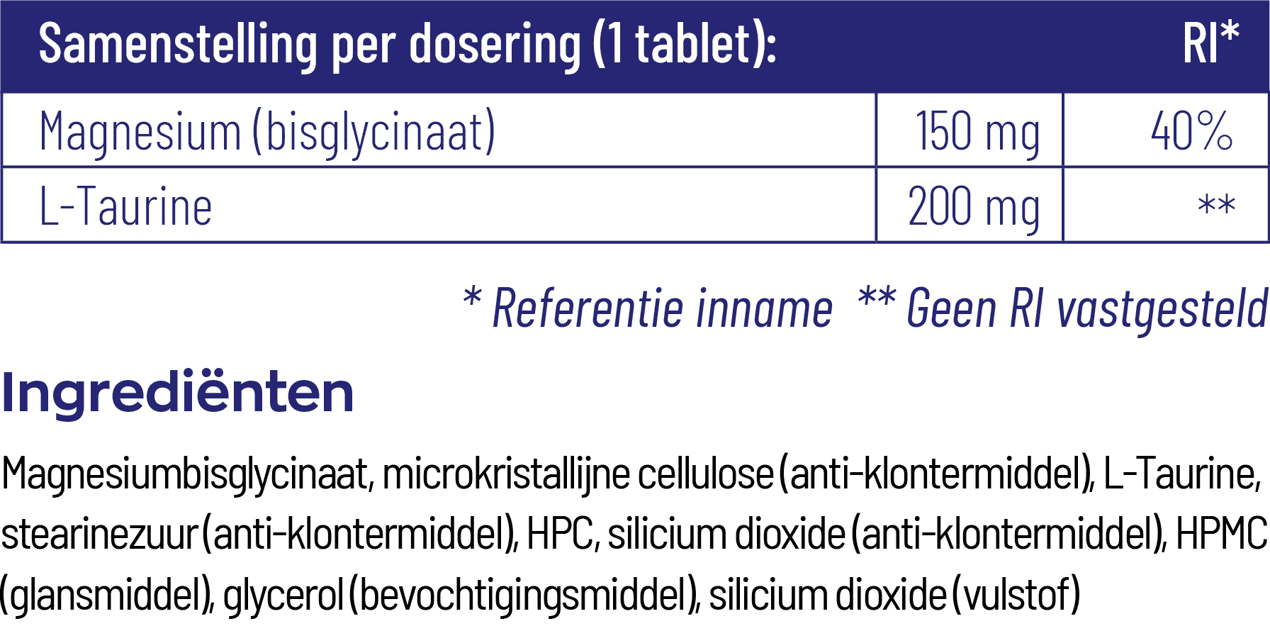 Magnesiumbisglycinaat, microkristallijne cellulose (anti-klontermiddel), L-Taurine, stearinezuur (anti-klontermiddel), HPC, silicium dioxide (anti-klontermiddel), HPMC (glansmiddel), glycerol (bevochtigingsmiddel), silicium dioxide (vulstof).