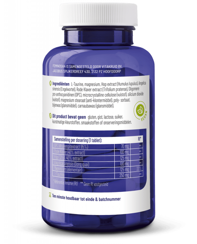Naast de overvloed aan werkzame stoffen in Feminosan, zijn we ook op zoek gegaan naar nutriënten die de opneembaarheid en werkzaamheid van rode klaver, hop en angelica sinensis bevorderen. In die zoektocht zijn we uitgekomen bij: magnesium, een duizendpoot voor de gezondheid, l-taurine, een waardevolle schakelaar en OPC, een turbo die de werkzame stoffen effectiever laat werken. Door de hoogwaardige hulp nutriënten in Feminosan is één tablet vaak al voldoende om het gewenste doel te bereiken.