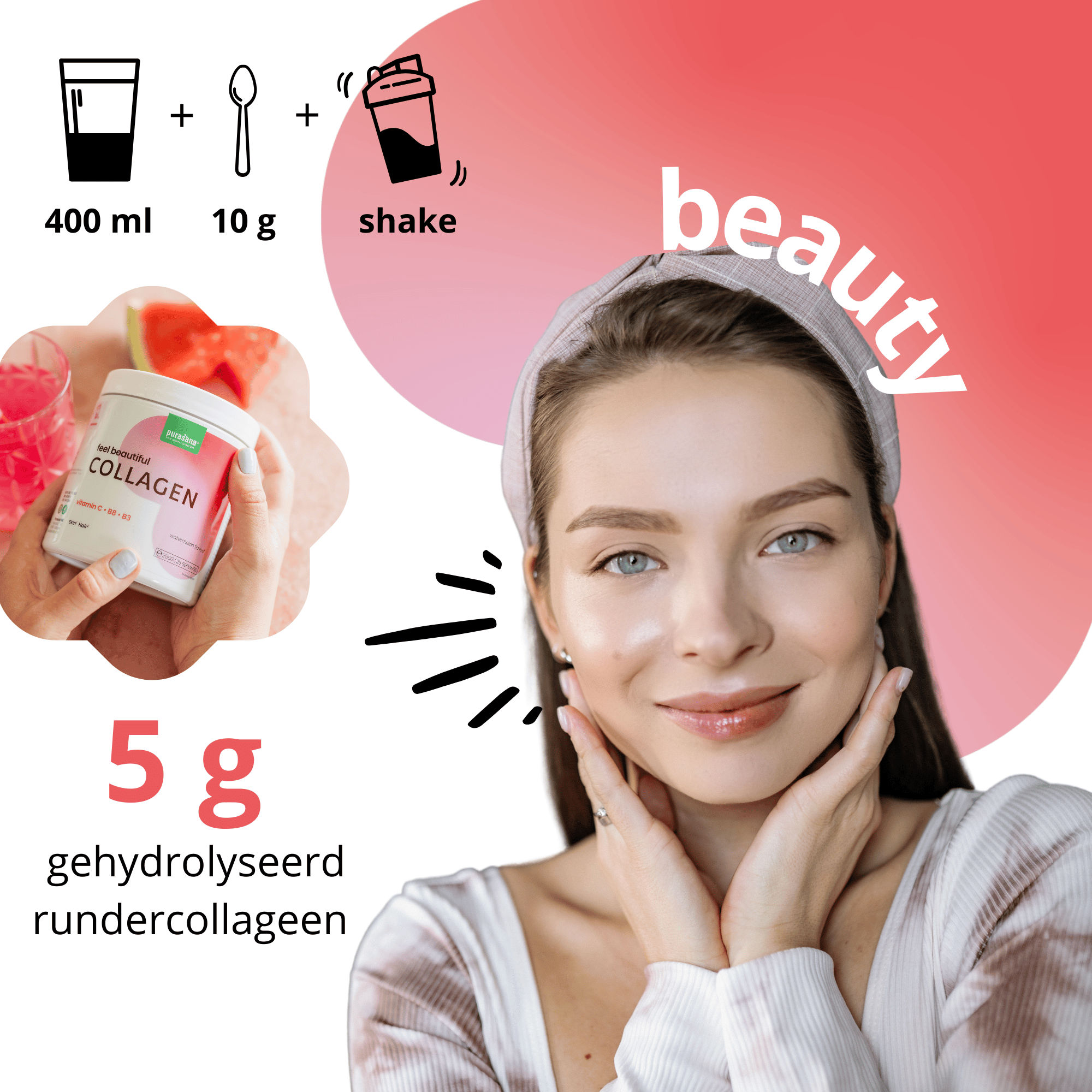 Gehydroliseerde collageen peptides, watermeloenpoeder (Citrus lanatus), appelpoeder (Malus domestica), sinaasappelpoeder (Citrus sinensis), vulmiddel (maltodextrine), natuurlijk aroma, vitamine C (ascorbinezuur), zuurteregelaar (citroenzuur), natuurlijke kleurstof (rode biet en beta caroteen), zoetstof (sucralose), vitamine B3 (niacine), vitamine B8 (biotine).