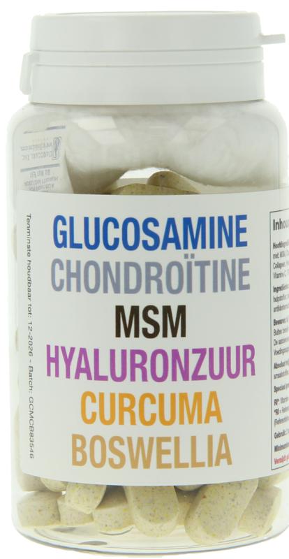 Glucosaminesulfaat 2KCl (SCHAALDIEREN), mix met: MSM, Chondroïtinesulfaat (VIS), Curcuma longa wortelextract 10:1, Boswellia extract 4:1, Collageen, Hyaluronzuur, Citrus-bioflavonoïde-extract, Kalium, Vitamine C, Mangaangluconaat.