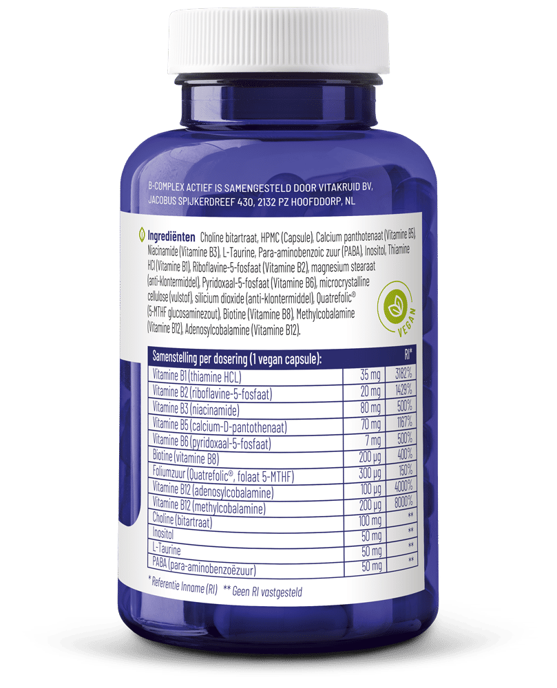 Het B-complex Actief bevat twee biologisch beschikbare vormen van vitamine B12. B12 in de vorm methylcobalamine heeft de ondersteunende eigenschap gestapeld folaat beschikbaar te maken voor het lichaam. De combinatie van methylcobalamine en adenosylcobalamine in de verhouding 50:50.