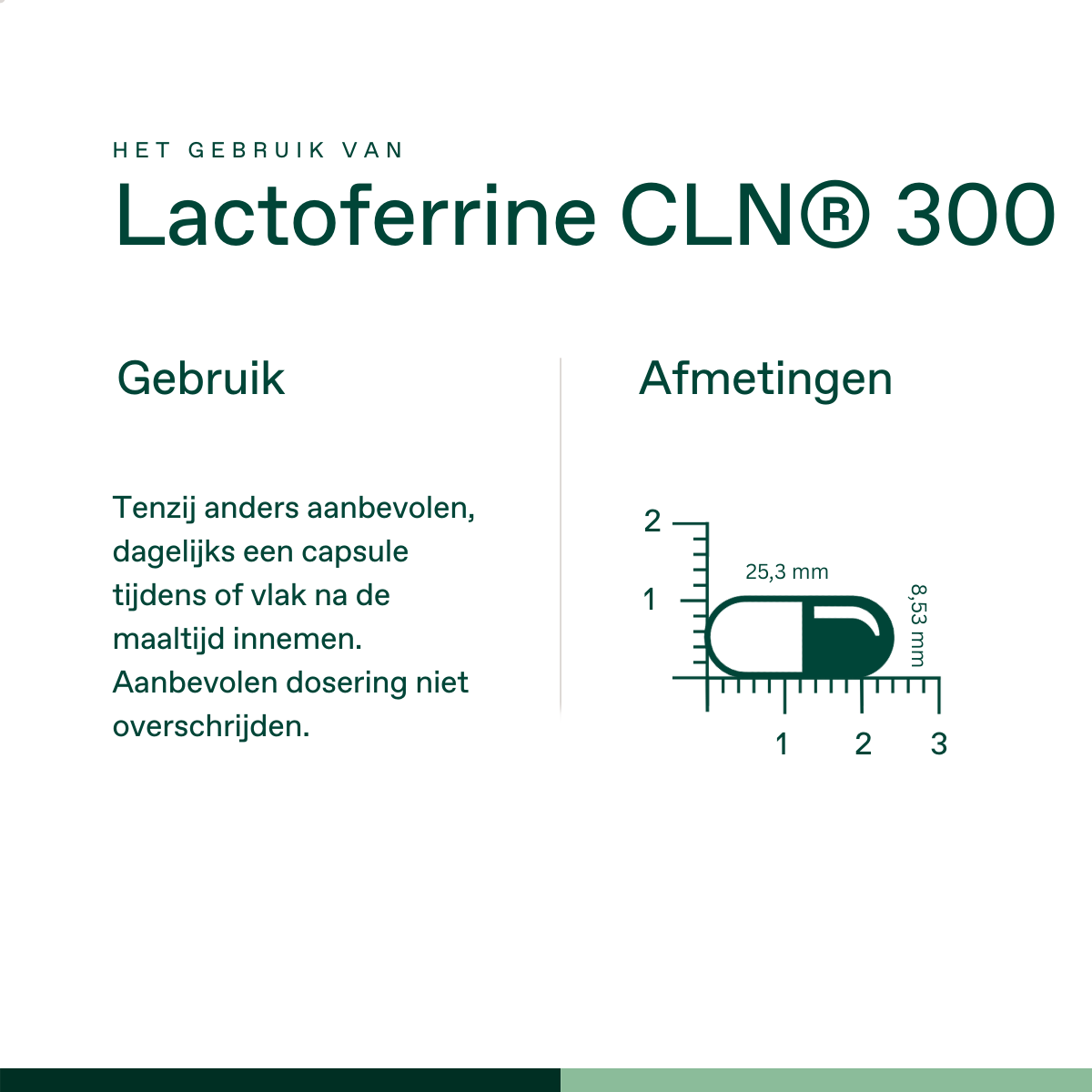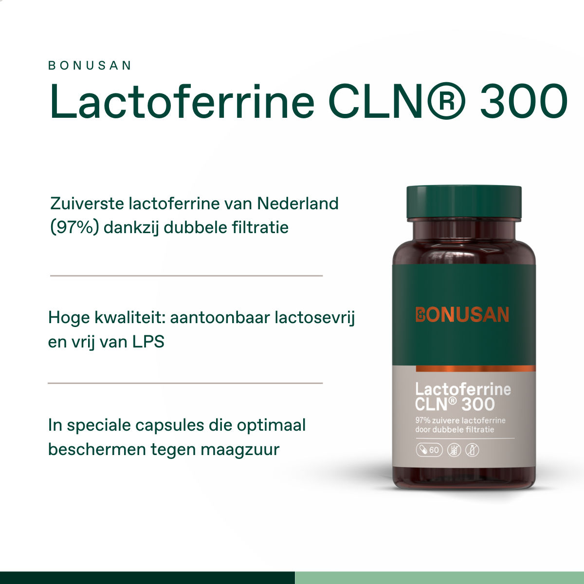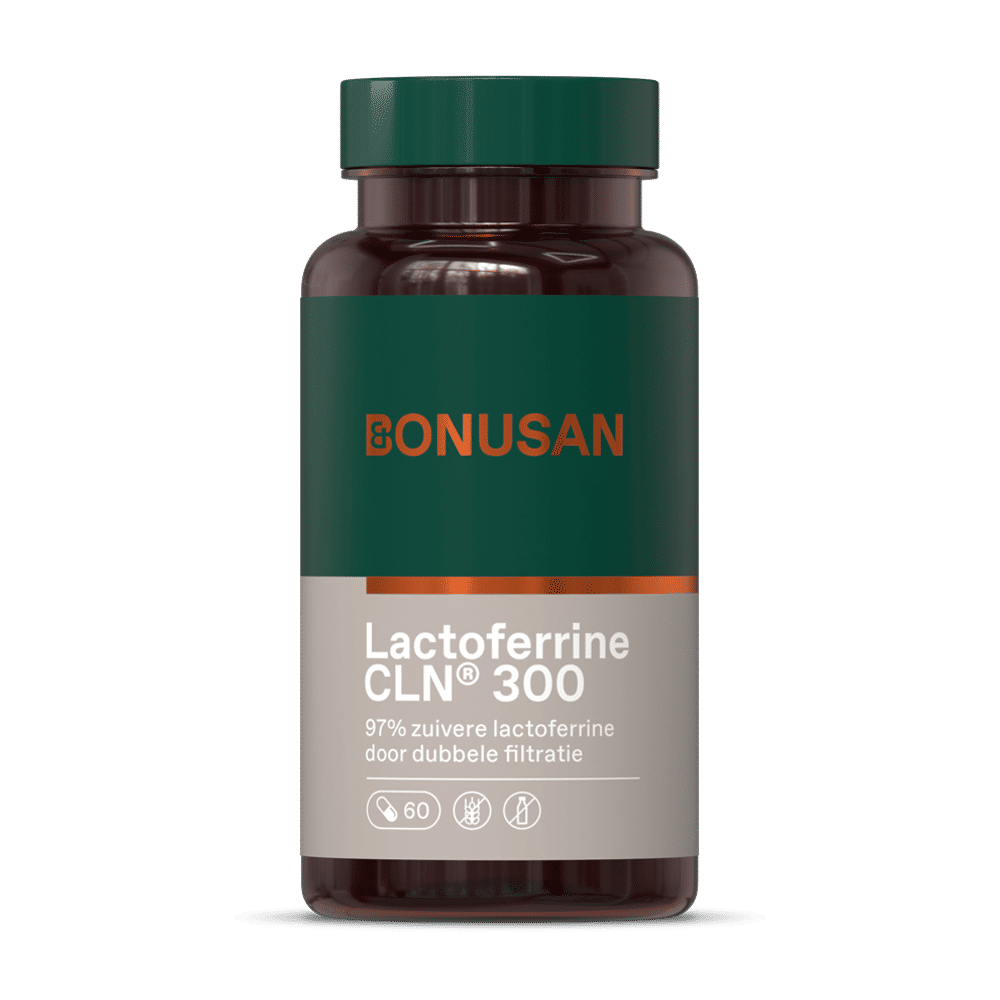 Lactoferrine is een lichaamseigen eiwit. Hoewel ons lichaam lactoferrine zelf aanmaakt, kan de behoefte aan lactoferrine in bepaalde situaties hoger liggen dan de productie. Bonusan Lactoferrine 300 mg bevat een bijzonder hoge dosering om de lichaamseigen productie snel aan te vullen.