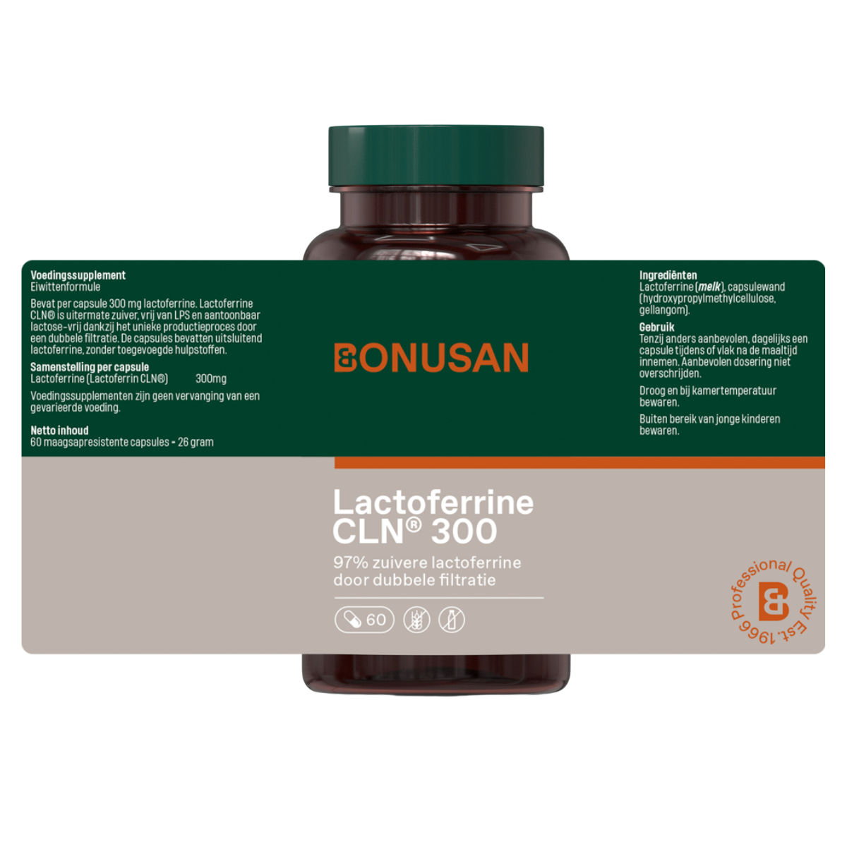 Bonusan Lactoferrine 300 mg bevat per capsule 300 mg natuurlijke en gezuiverde lactoferrine zonder detecteerbare niveaus van LPS.