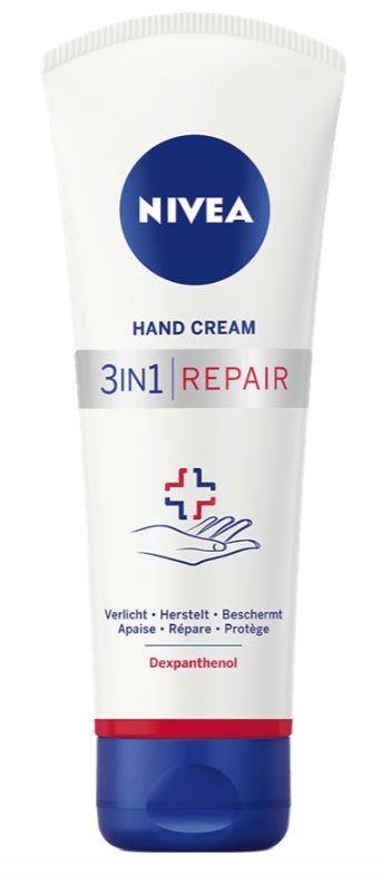 Nivea 3in1 Repair Handcrème geeft je in een handomdraai 24 uur lang zachte en beschermde handen. De geconcentreerde formule met Dexpanthenol herstelt onmiddellijk zeer droge en trekkerige handen, geeft langdurige hydratatie en versterkt de huidbarrière om verlies van vocht te voorkomen.