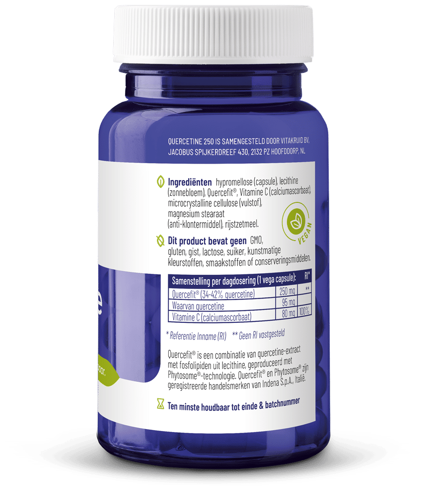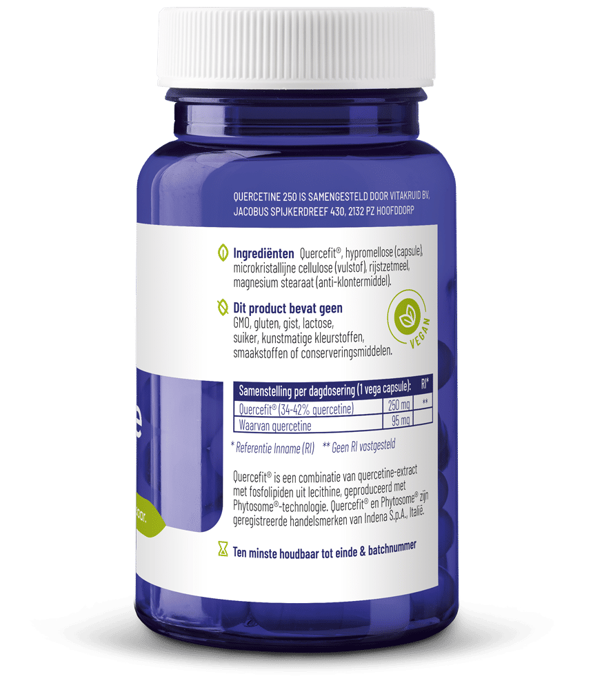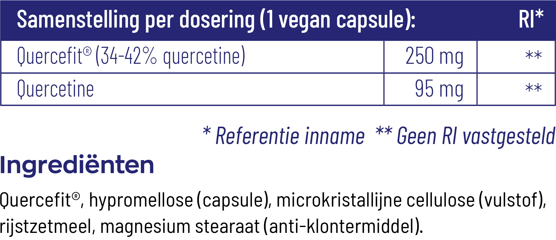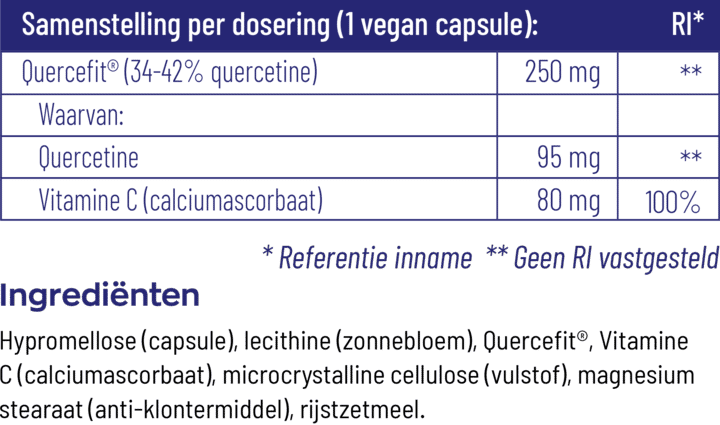 Quercefit®, hypromellose (capsule), microkristallijne cellulose (vulstof), rijstzetmeel, magnesium stearaat (anti-klontermiddel).