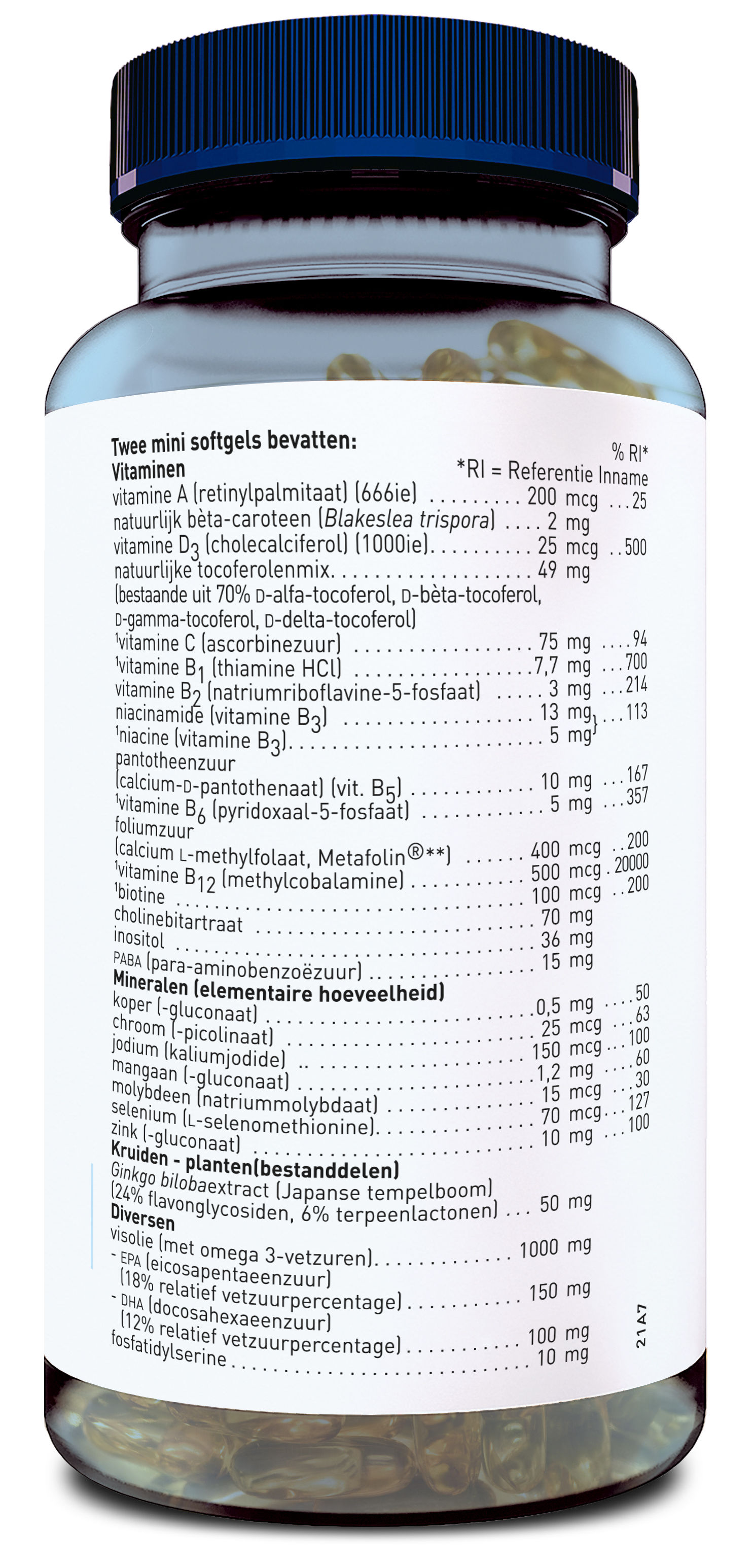 | Samenstelling per dagdosering van 2 mini softgels | % RI* | |