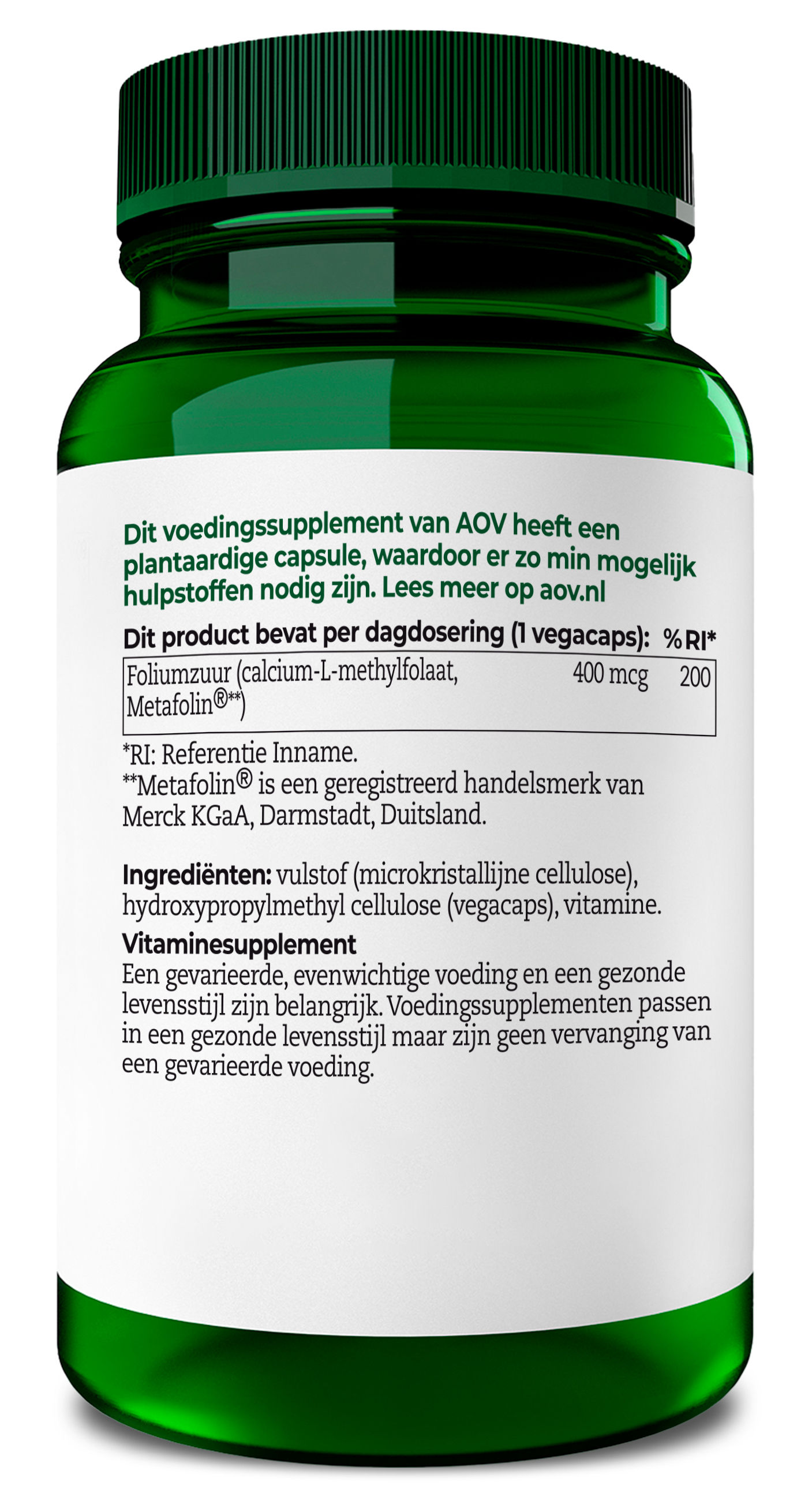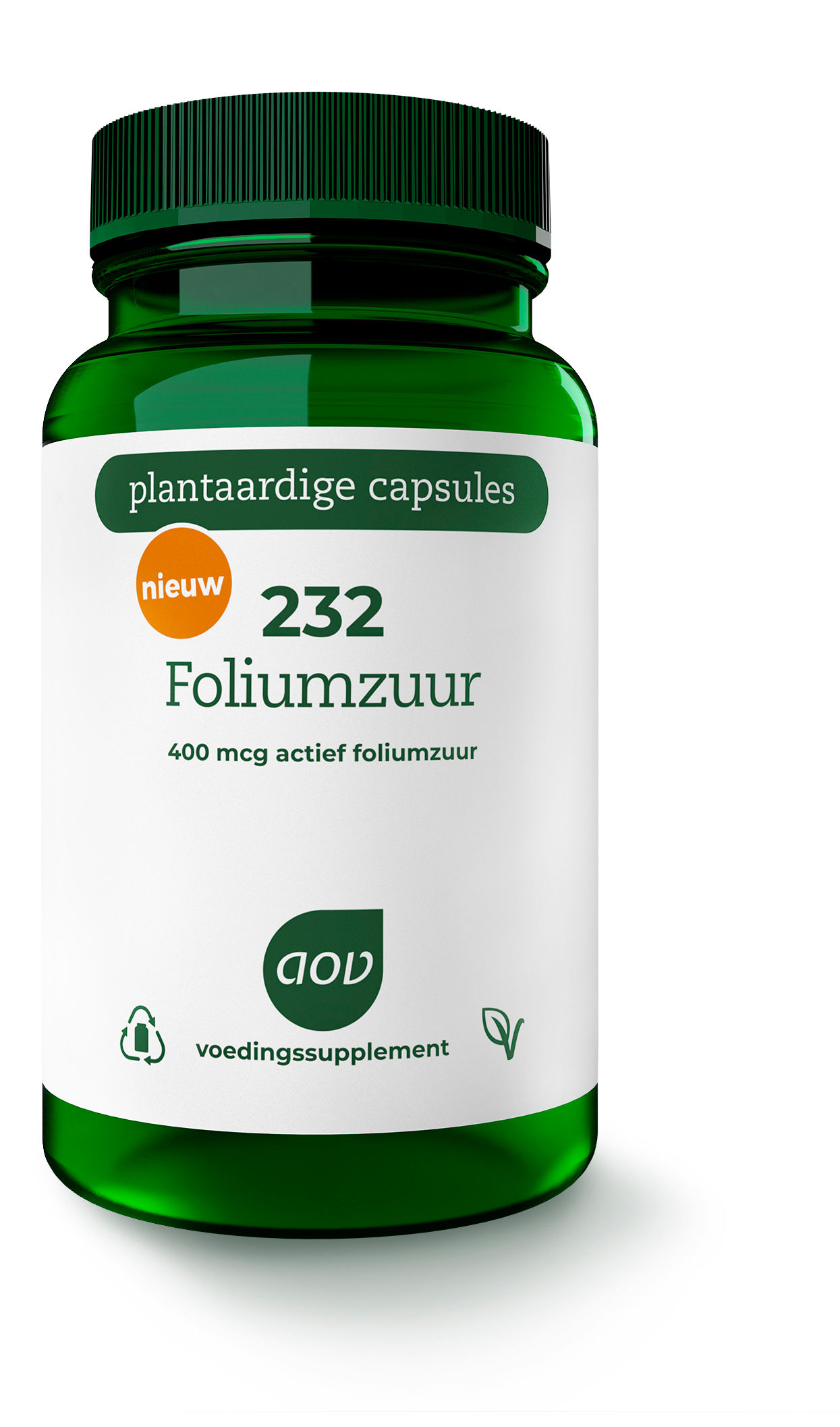 232 Foliumzuur van AOV bevat het gepatenteerde Metafolin®, een goed opneembare biologisch actieve vorm van foliumzuur.