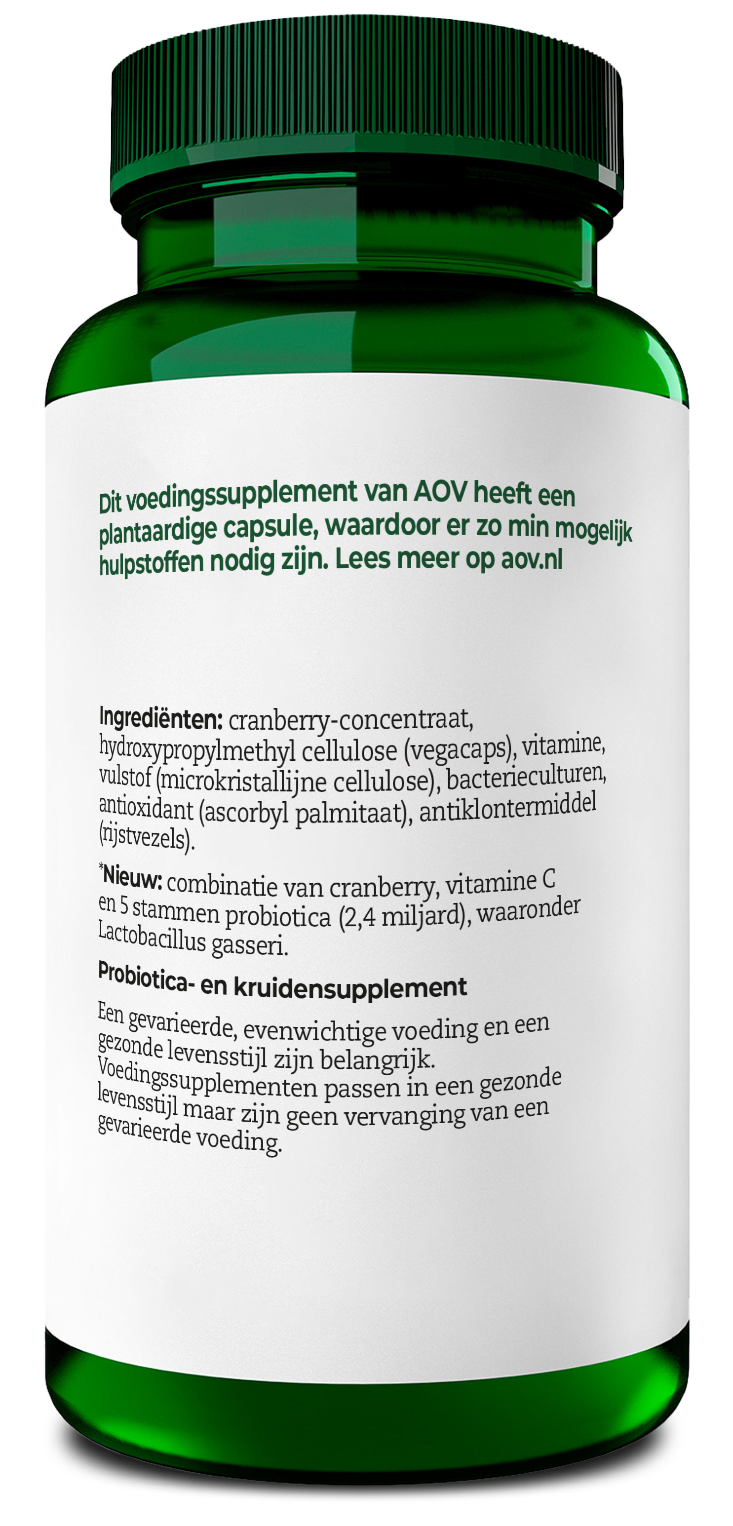 Cranberry concentraat, hydroxypropylmethyl cellulose (vegacaps), vitamine, vulstof (microkristallijne cellulose), bacterieculturen, antioxidant (ascorbyl palmitaat), rijstconcentraat