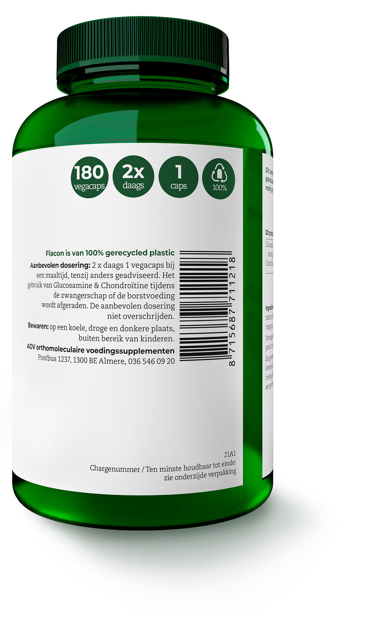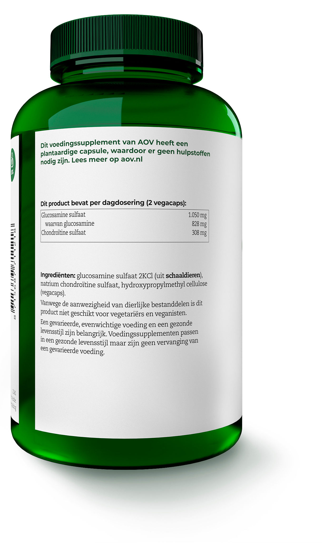 Glucosamine sulfaat 2KCl (uit SCHAALDIEREN), natrium chondroïtine sulfaat, HPMC (vegacaps).