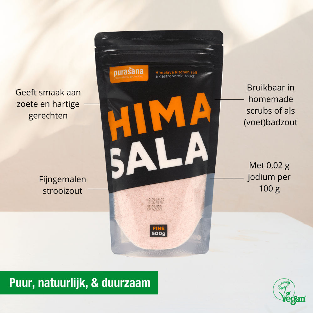 Van oudsher wordt zout bij elke maaltijd gebruikt als smaakversterker en daarnaast biedt het tal van conserveringsmogelijkheden. Zout is namelijk essentieel voor het lichaam, je kunt niet zonder. Purasana Himasala keukenzout geeft je gerechten een verfijnde smaaktoets en bestaat zowel uit fijne als grove korrel. Je kunt Himalayazout naar smaak over koude en warme gerechten strooien.