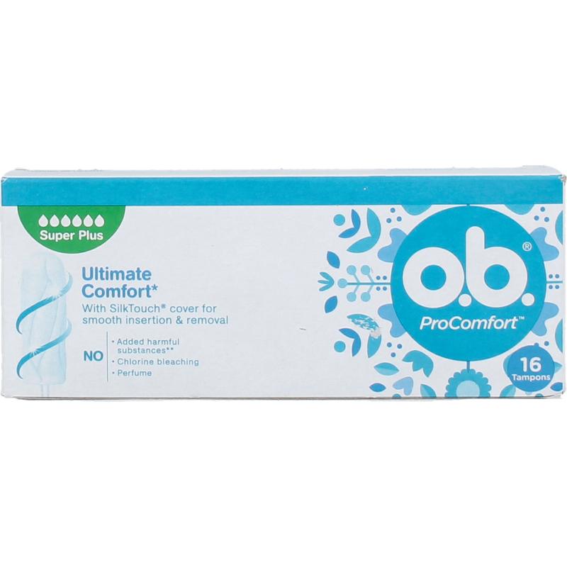 o.b.® ProComfort® Super Plus Tampons met Dynamic Fit™ -technologie en SilkTouch®-oppervlak zorgen voor ultiem comfort* en betrouwbare bescherming voor de zeer zware dagen van uw menstruatie (* binnen het o.b.®-assortiment). De Dynamic Fit-technologie met 3D-expansie zorgt ervoor dat de tampon zich op een natuurlijke wijze naar het lichaam vormt en de unieke in elkaar overlopende groeven helpen de vloeistof naar de kern van de tampon te leiden. Met SilkTouch oppervlak voor probleemloos inbrengen en verwijderen. De tampons zijn gynaecologisch getest, hebben een kern die 100% plantaardig is, zonder schadelijke chemische stoffen (o.a. pesticiden). o.b.® ProComfort® Super Plus tampons zijn chloor- en parfumvrij.