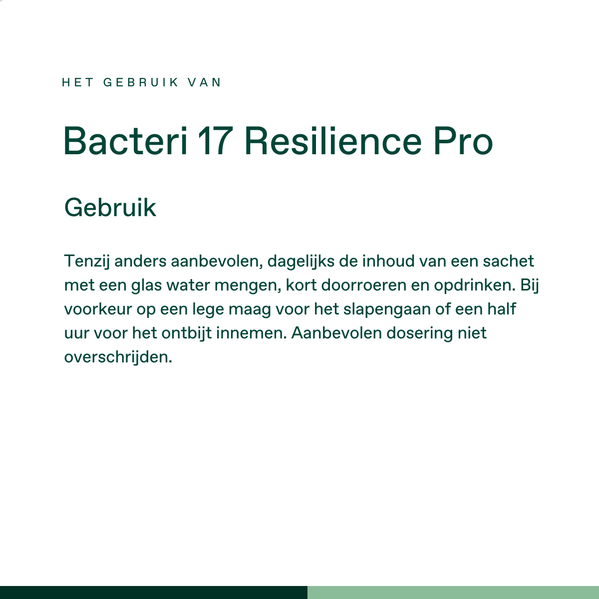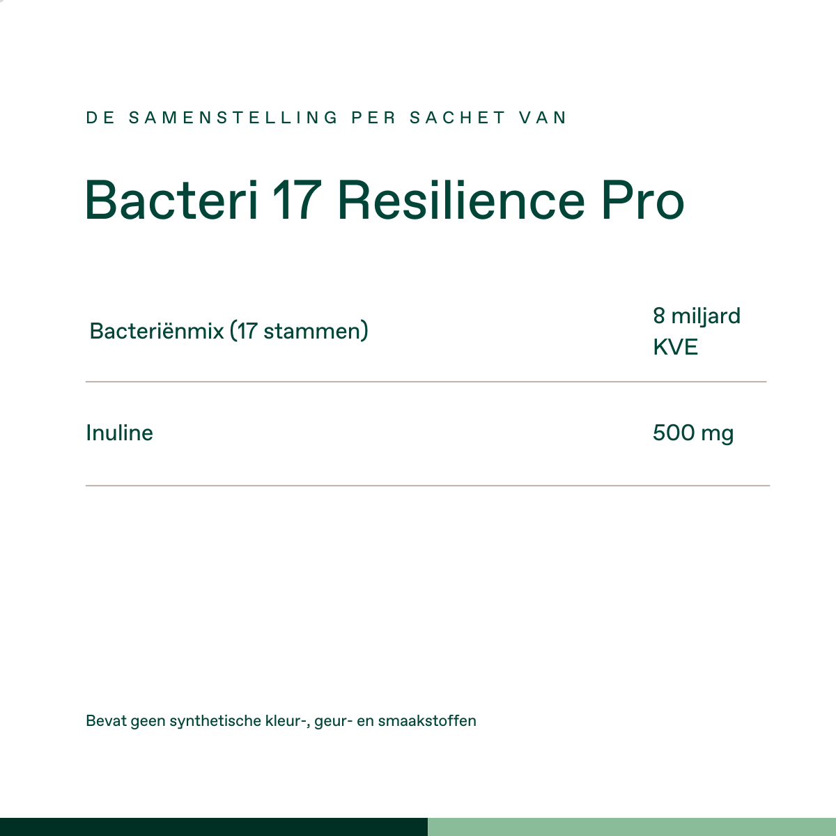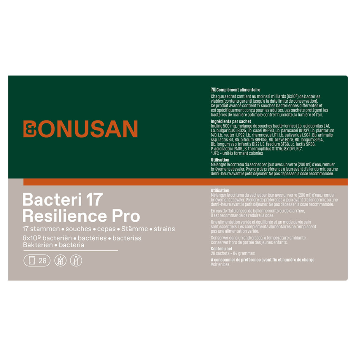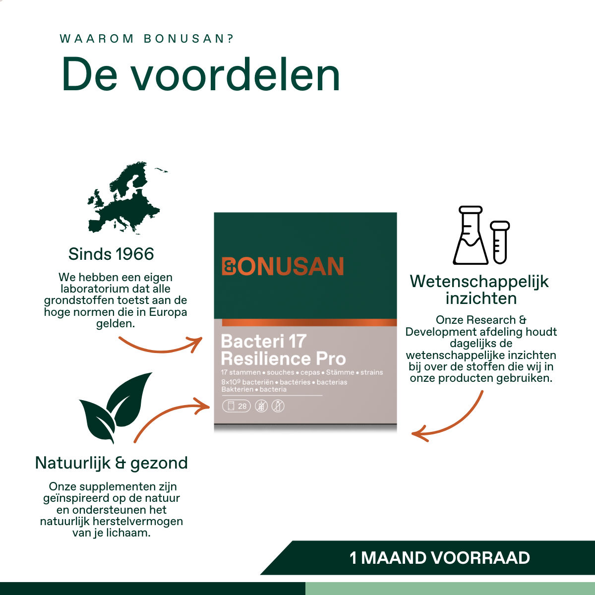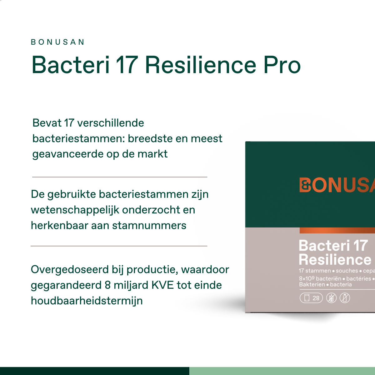 Bonusan Bacteri 17 Resilience Pro is met 17 verschillende bacteriestammen het breedste en meest geavanceerde probioticum op de markt. Hoe breder het spectrum, hoe beter dit past bij de natuurlijke situatie in de darm. Naast 5 soorten bifidobacteriën en 8 soorten lactobacillen bevat Bacteri 17 Resilience Pro daarom ook onder andere lactococcen, pediococcen en enterococcen. Omdat we overdoseren op het moment van productie, bevat elk sachet tot het eind van de houdbaarheidstermijn gegarandeerd minimaal 8 miljard levensvatbare bacteriën (KVE).