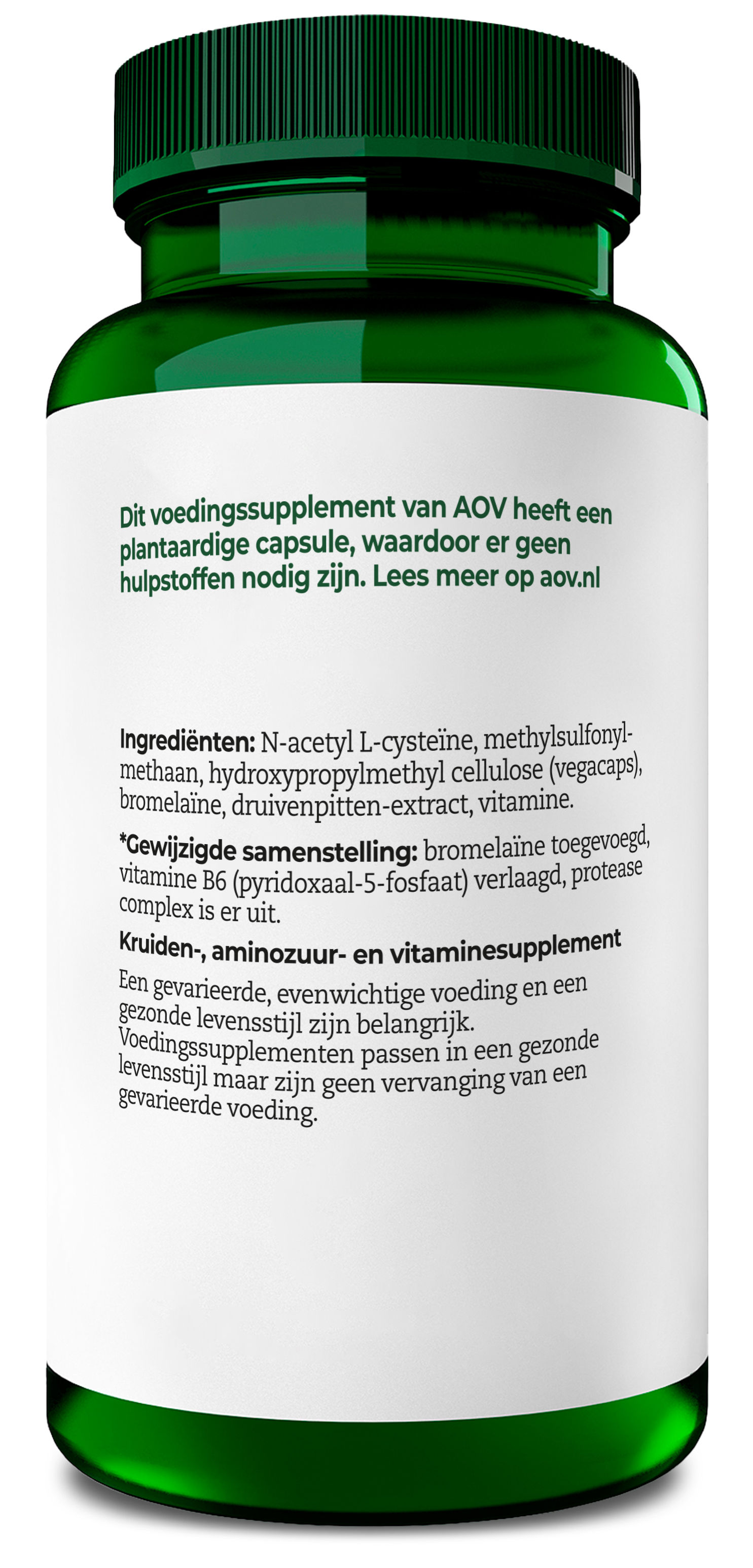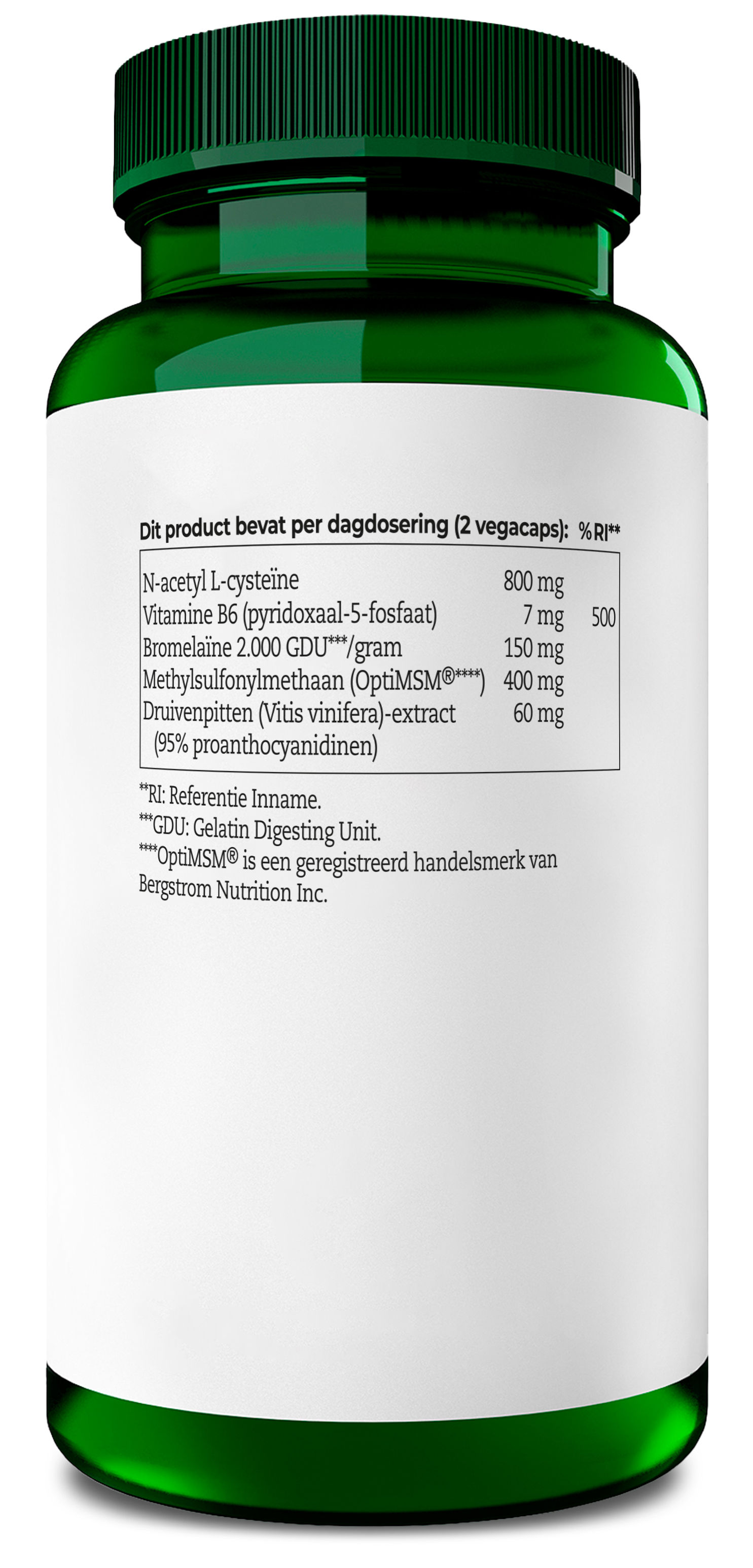 N-acetyl L-cysteïne, methylsulfonylmethaan, hydroxypropylmethyl cellulose (vegacaps), bromelaïne, druivenpitten-extract, vitamine.