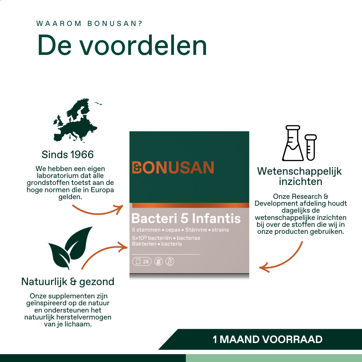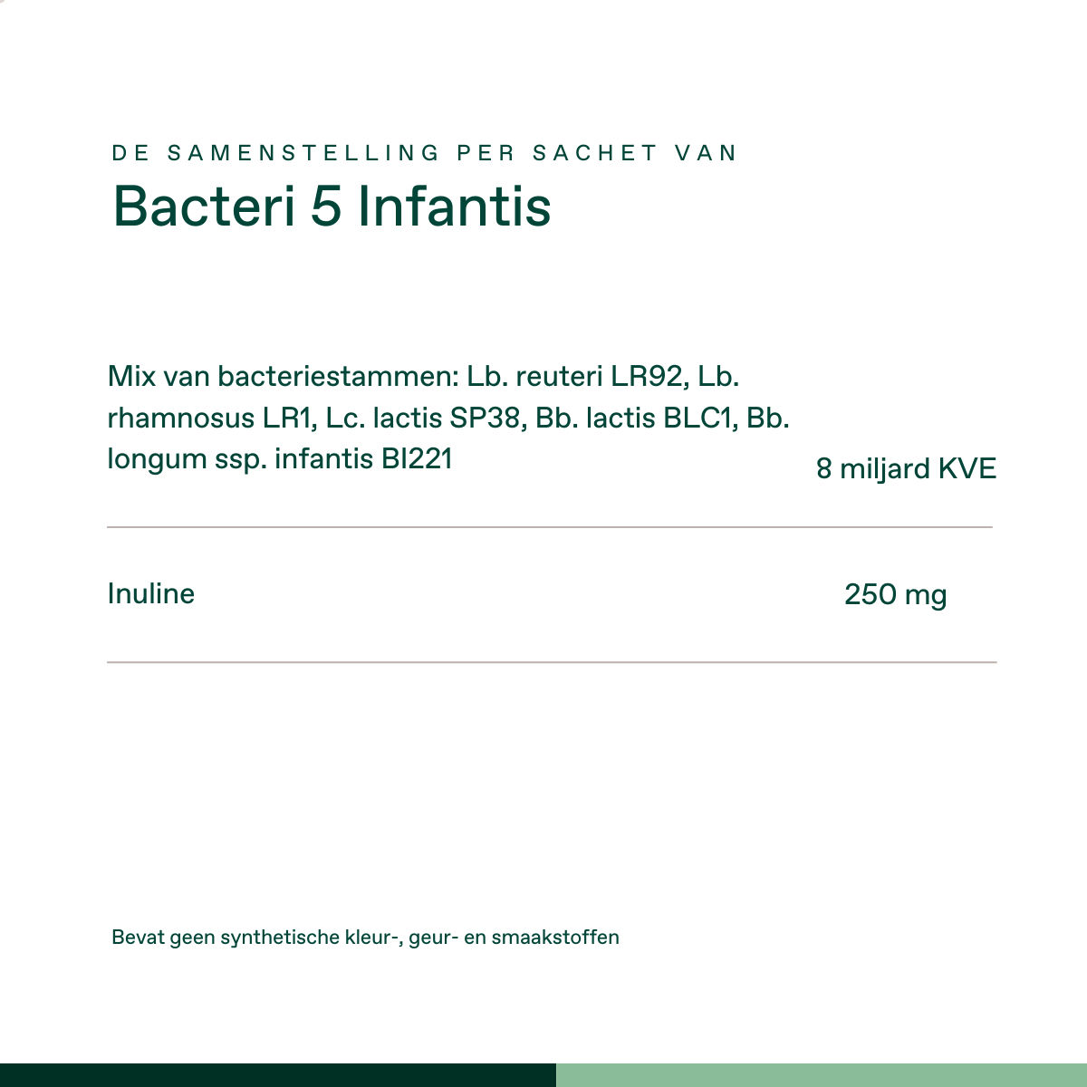 Bacteri 5 Infantis biedt een complete samenstelling voor ondersteuning aan de start van de eerste levensfase. Het bevat uitsluitend wetenschappelijk onderzochte bacteriestammen speciaal voor jonge kinderen, baby’s en zwangere vrouwen. Dit product bevat geen zoet- of smaakstoffen en is volledig lactosevrij.
