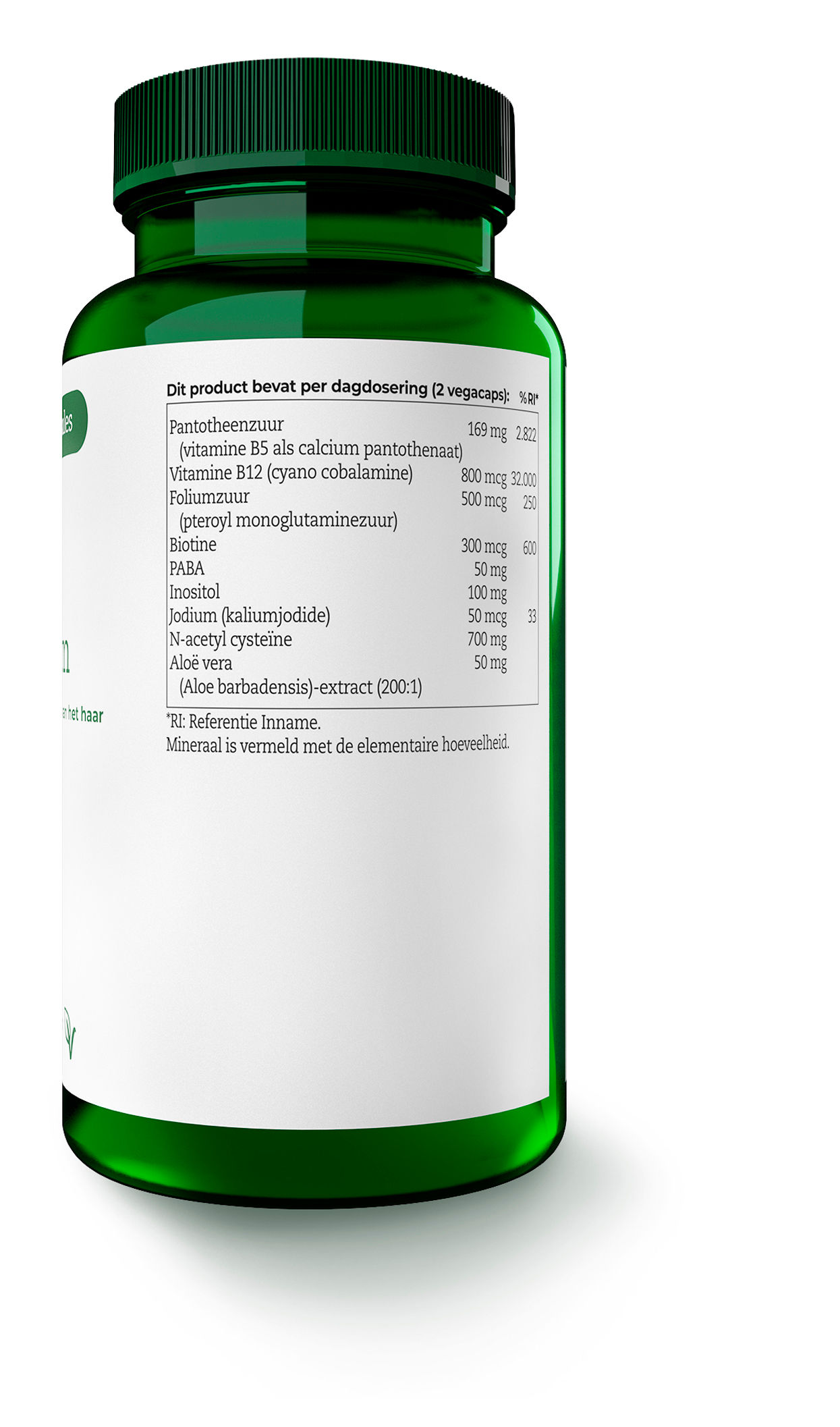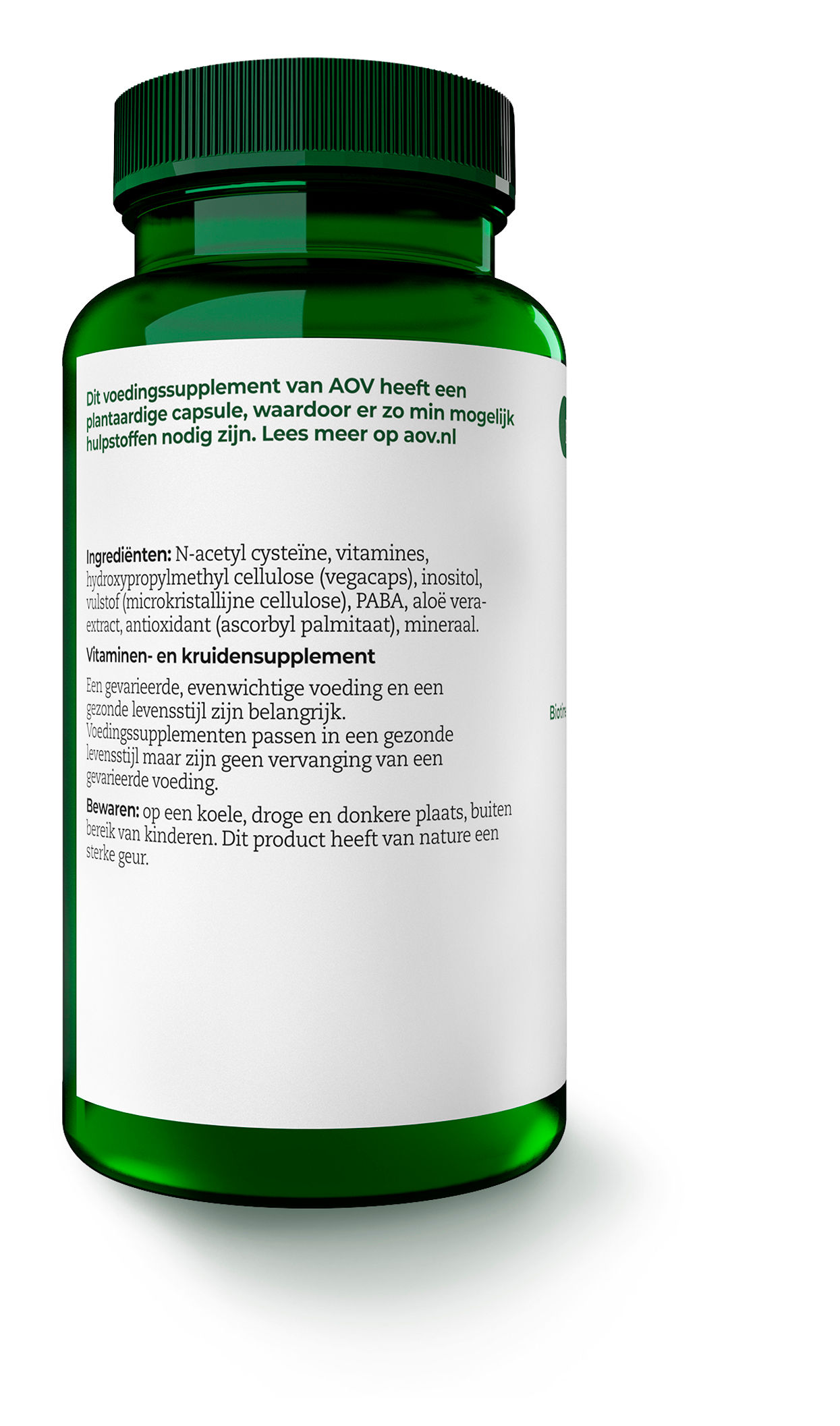N-acetyl cysteïne, vitamines, hydroxypropylmethylcellulose (vegacaps), inositol, vulstof (microkristallijne cellulose), PABA, aloë vera-extract, antioxidant (ascorbyl palmitaat), mineraal