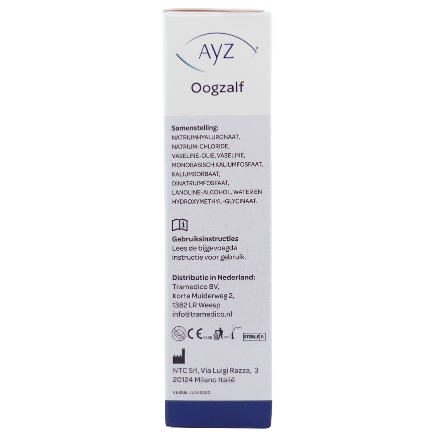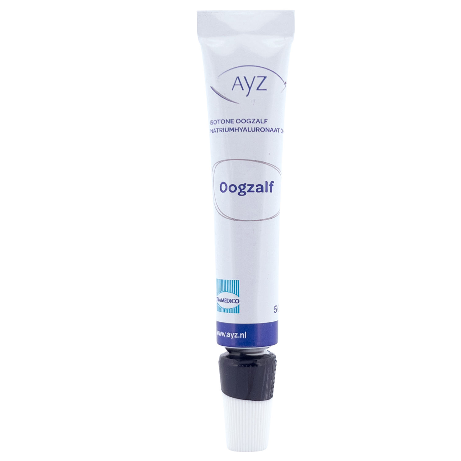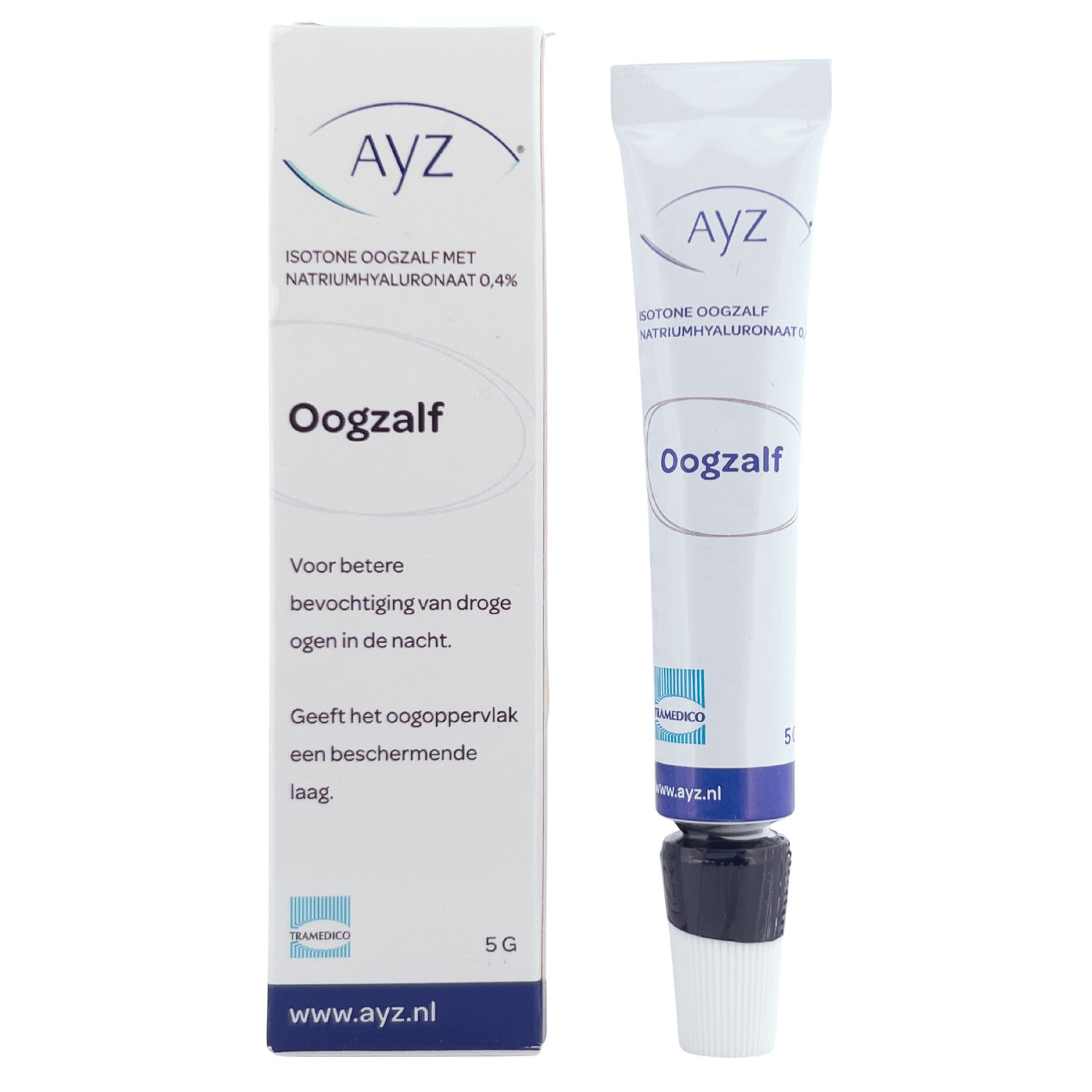 AYZ Oogzalf is een steriele, isotone oogzalf met natriumhyaluronaat 0,4% voor betere bevochtiging van droge ogen in de nacht. De zalf geeft het oogoppervlak een beschermende laag. Een tube bevat 5 g.