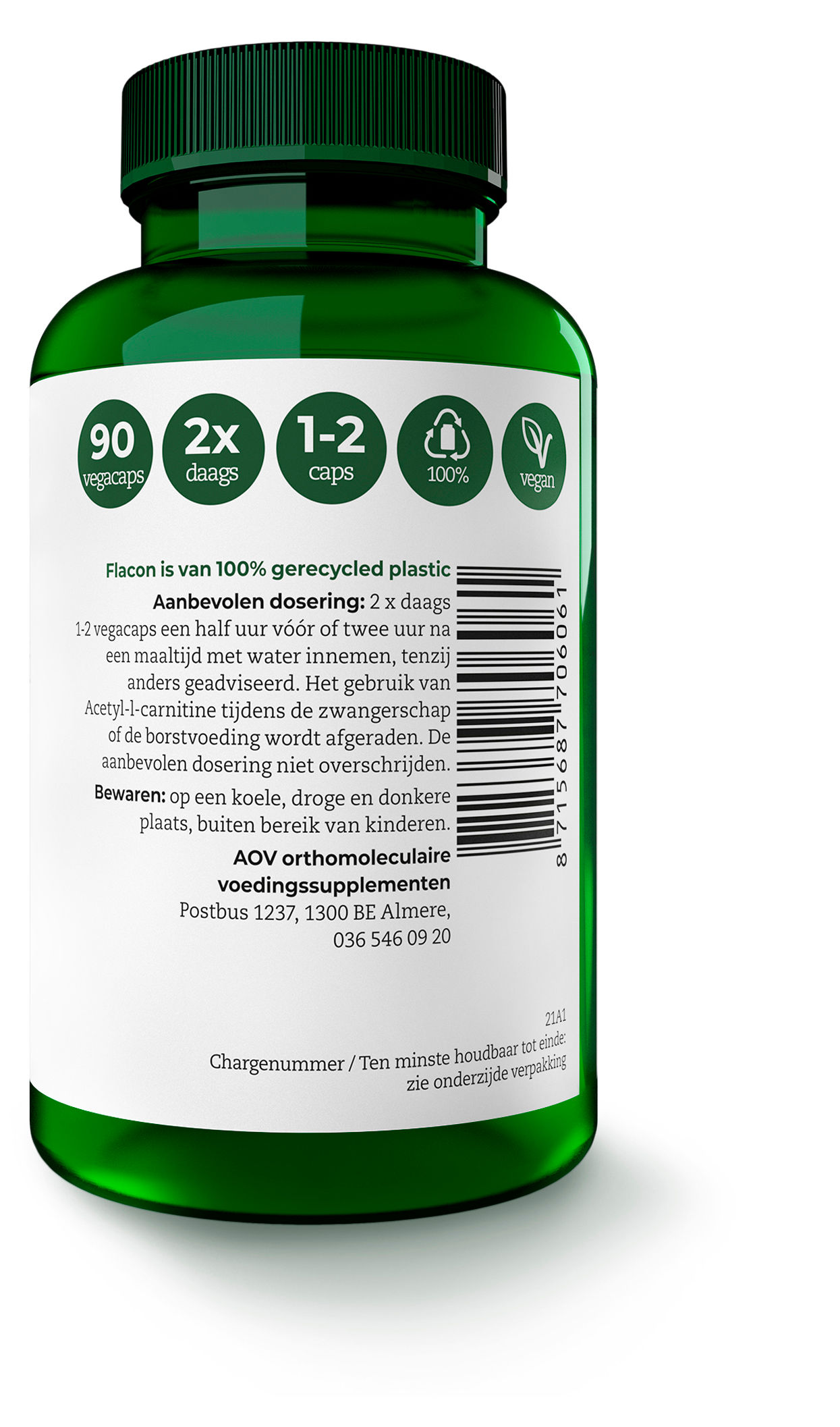 Acetyl-l-carnitine, hydroxypropylmethyl cellulose (vegacaps), vulstof (microkristallijne cellulose), antioxidant (ascorbyl palmitaat)