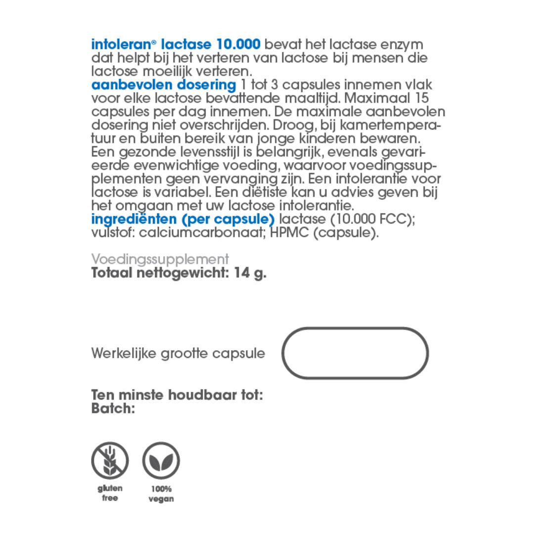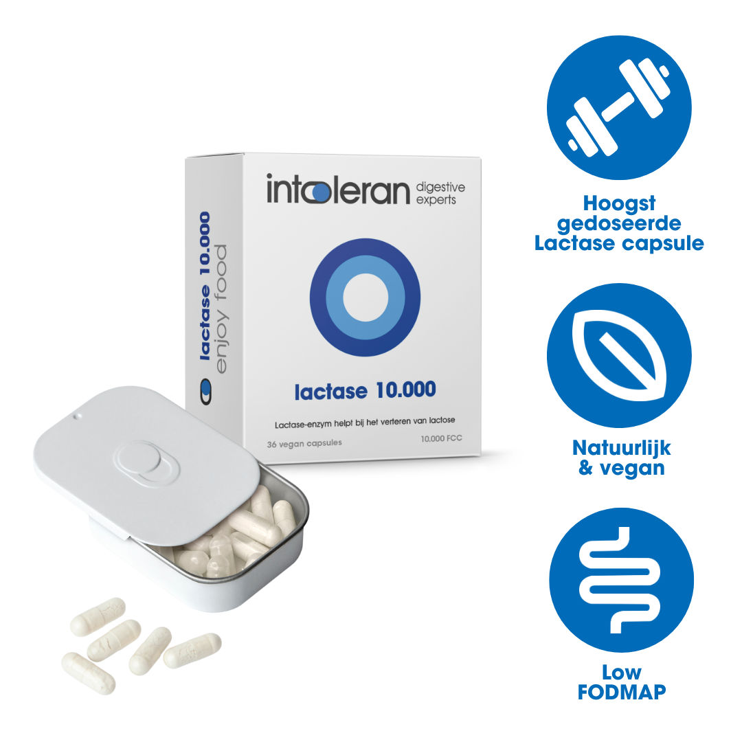 Intoleran lactase 10.000 bevat het lactase enzym, wat helpt bij de vertering van lactose bij personen die lactose moeilijk verteren.