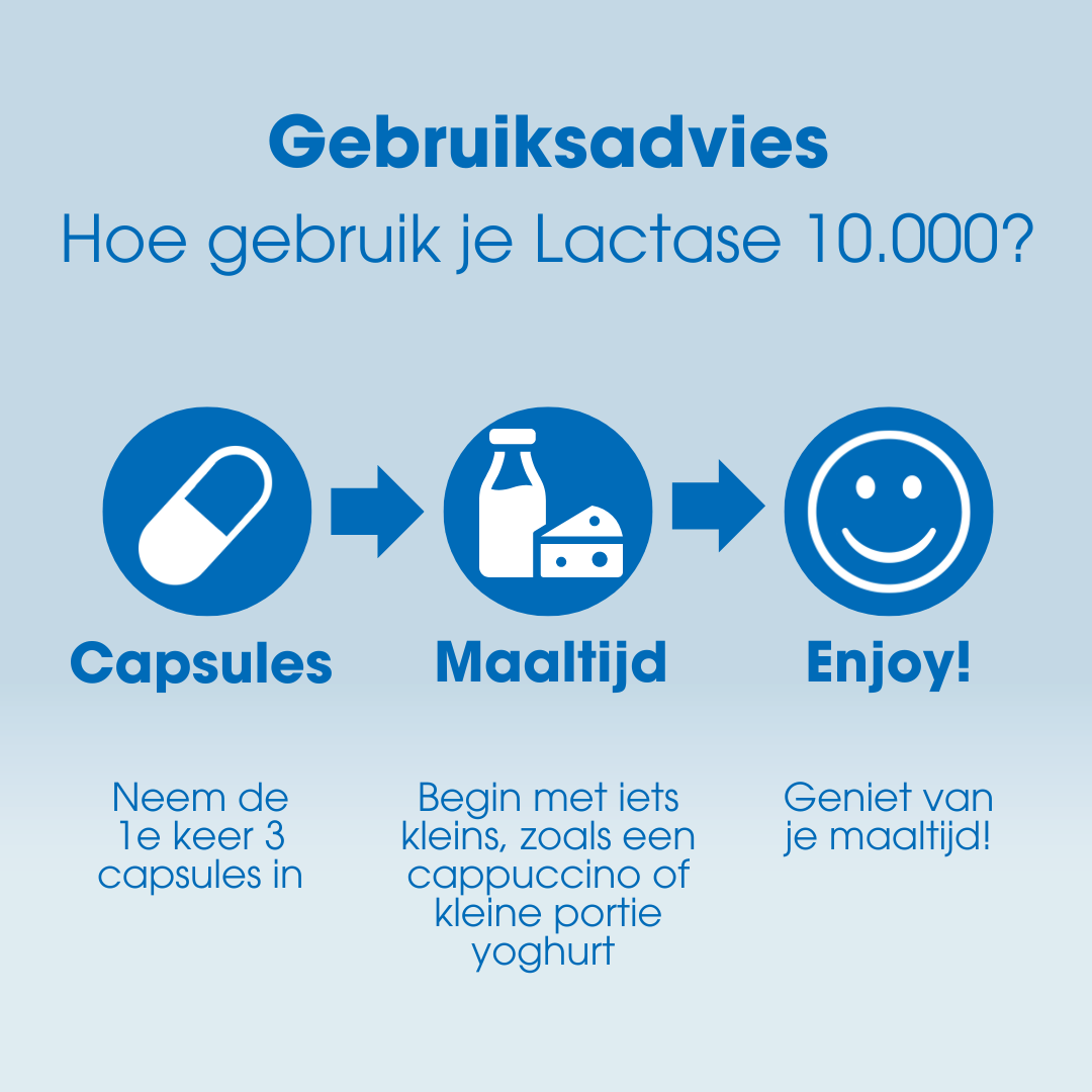 Vlak voor elke lactose bevattende maaltijd 1 tot 3 capsules innemen om de lactose uit die maaltijd te kunnen verteren. Maximaal 15 capsules per dag gebruiken.