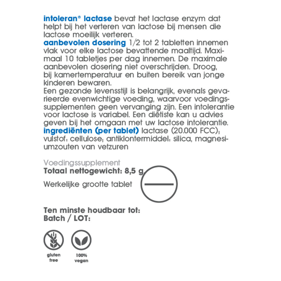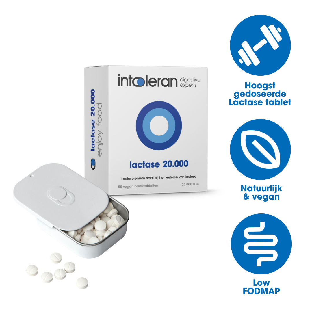 Intoleran lactase 20.000 bevat het lactase enzym, wat helpt bij de vertering van lactose bij personen die lactose moeilijk verteren.