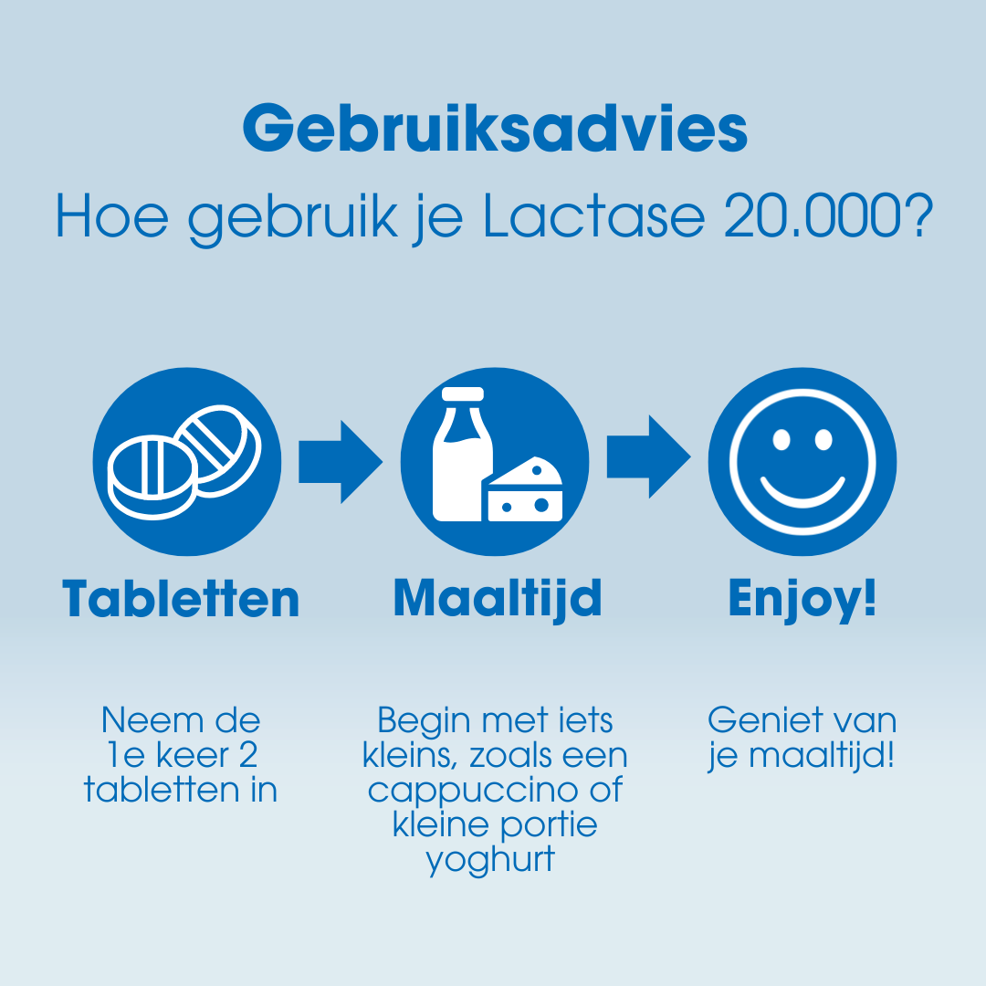 Vlak voor elke lactose bevattende maaltijd 1/2 tot 2 tabletten innemen om de lactose uit die maaltijd te kunnen verteren. Maximaal 10 tabletten per dag gebruiken. Voor mensen met een erg hevige lactose intolerantie en om grote hoeveelheden lactose per maaltijd te kunnen verteren