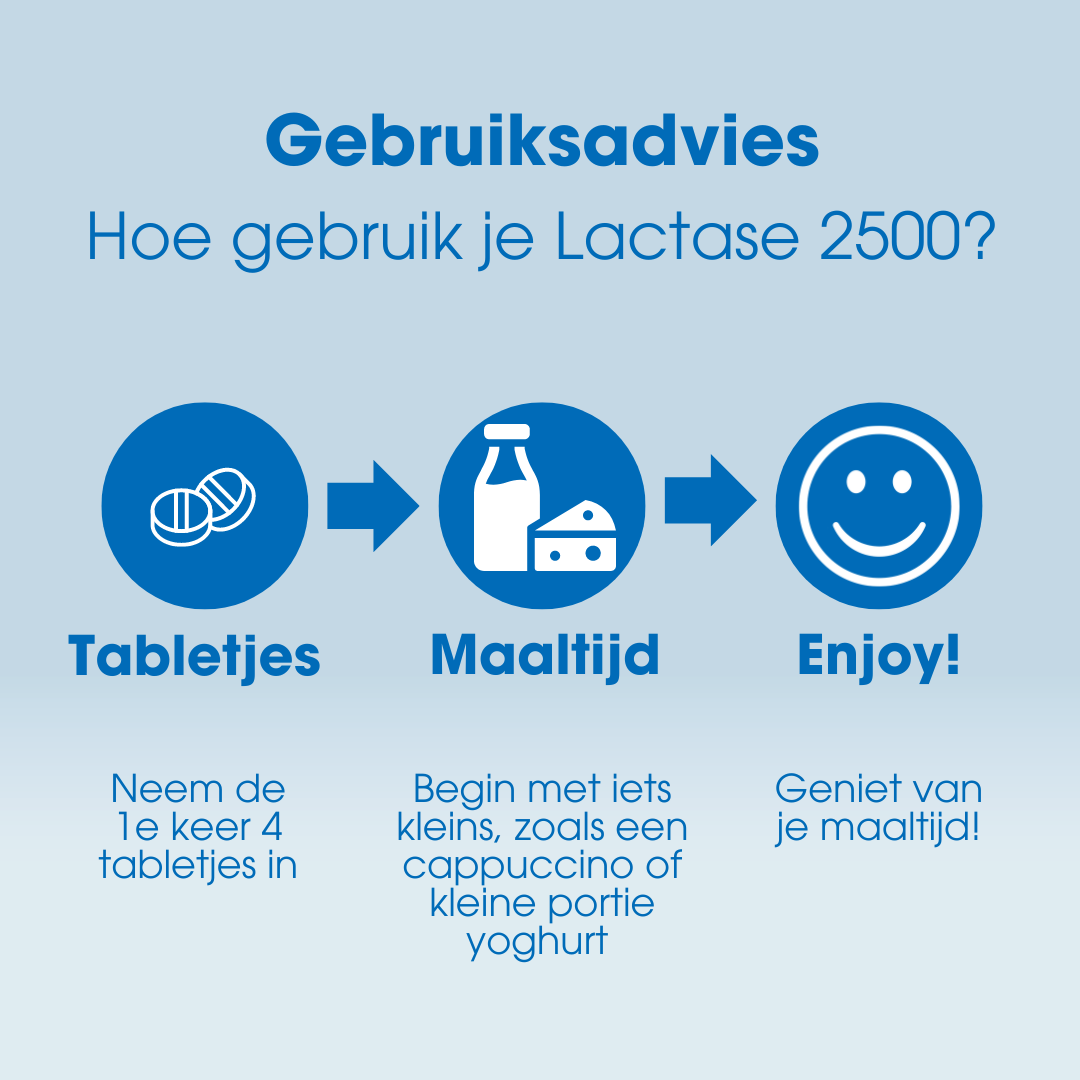 Voeg 5 lactase druppels toe aan 1 liter melk of andere zoete, vloeibare zuivel. Goed doorroeren/ schudden en 24 uur in de koelkast laten staan. Hierna is minimaal 80% van de lactose afgebroken. Voeg meer druppels toe voor een hoger