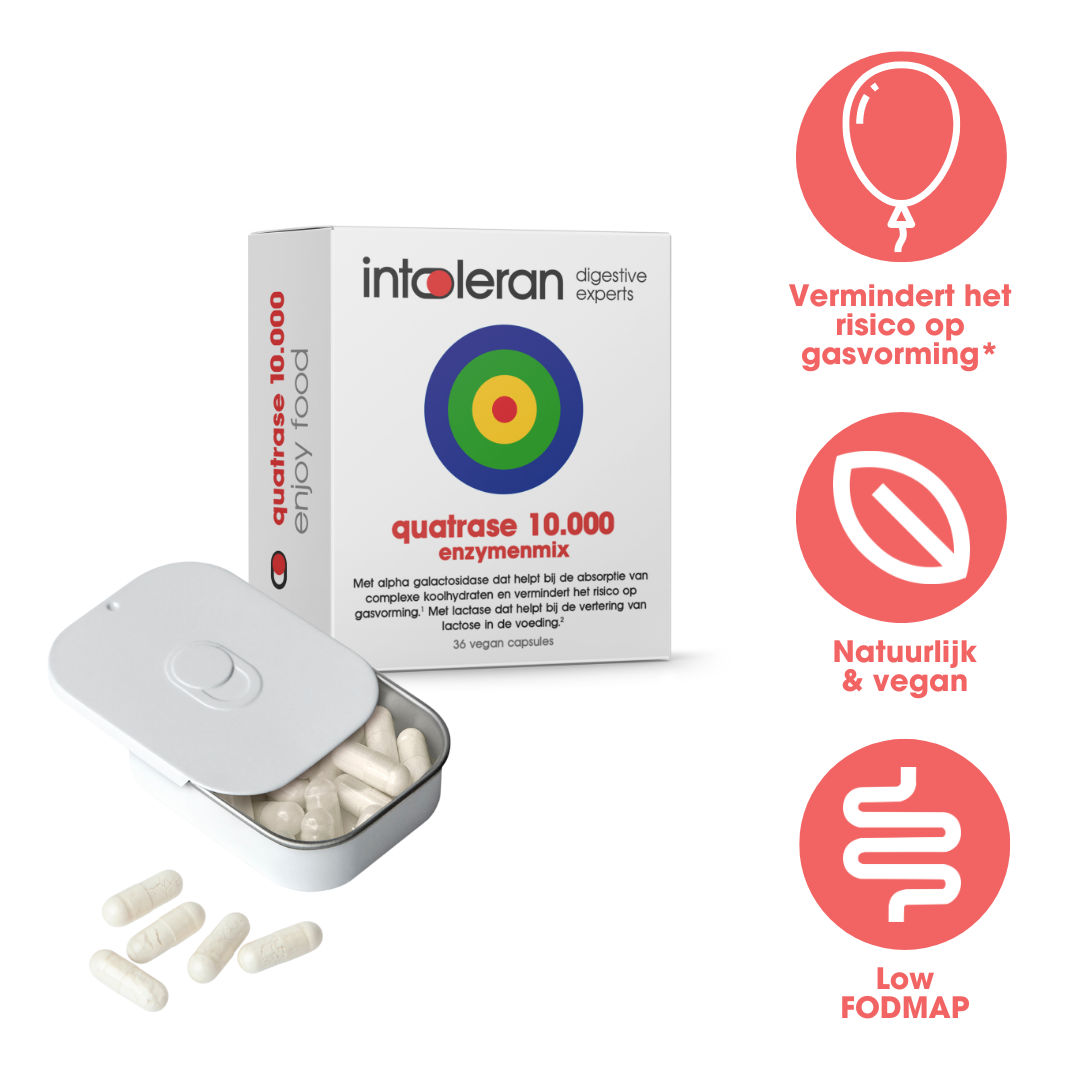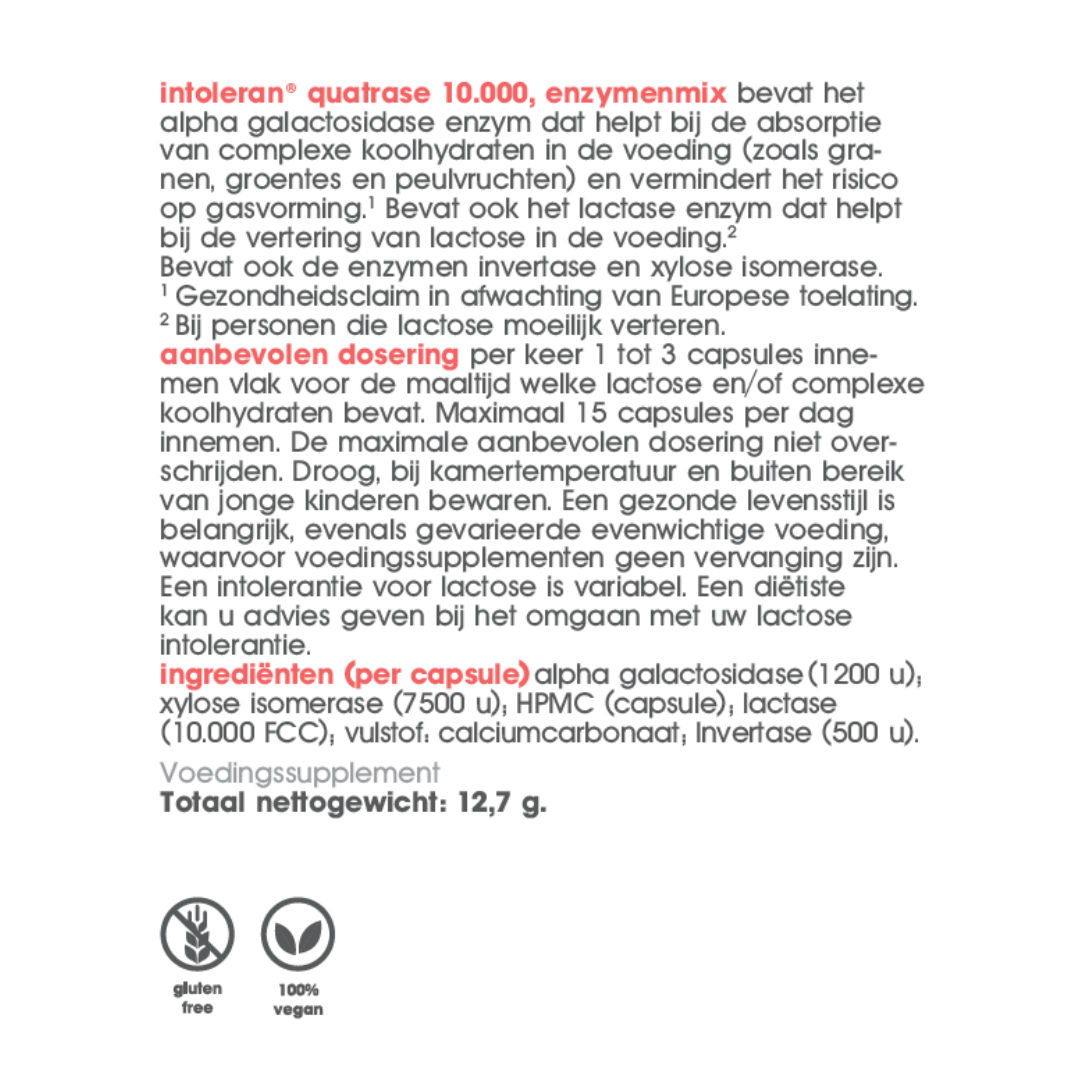 Intoleran quatrase 10.000, enzymenmix, bevat een combinatie van 4 spijsverteringsenzymen: lactase, alpha-galactosidase, xylose isomerase en invertase.