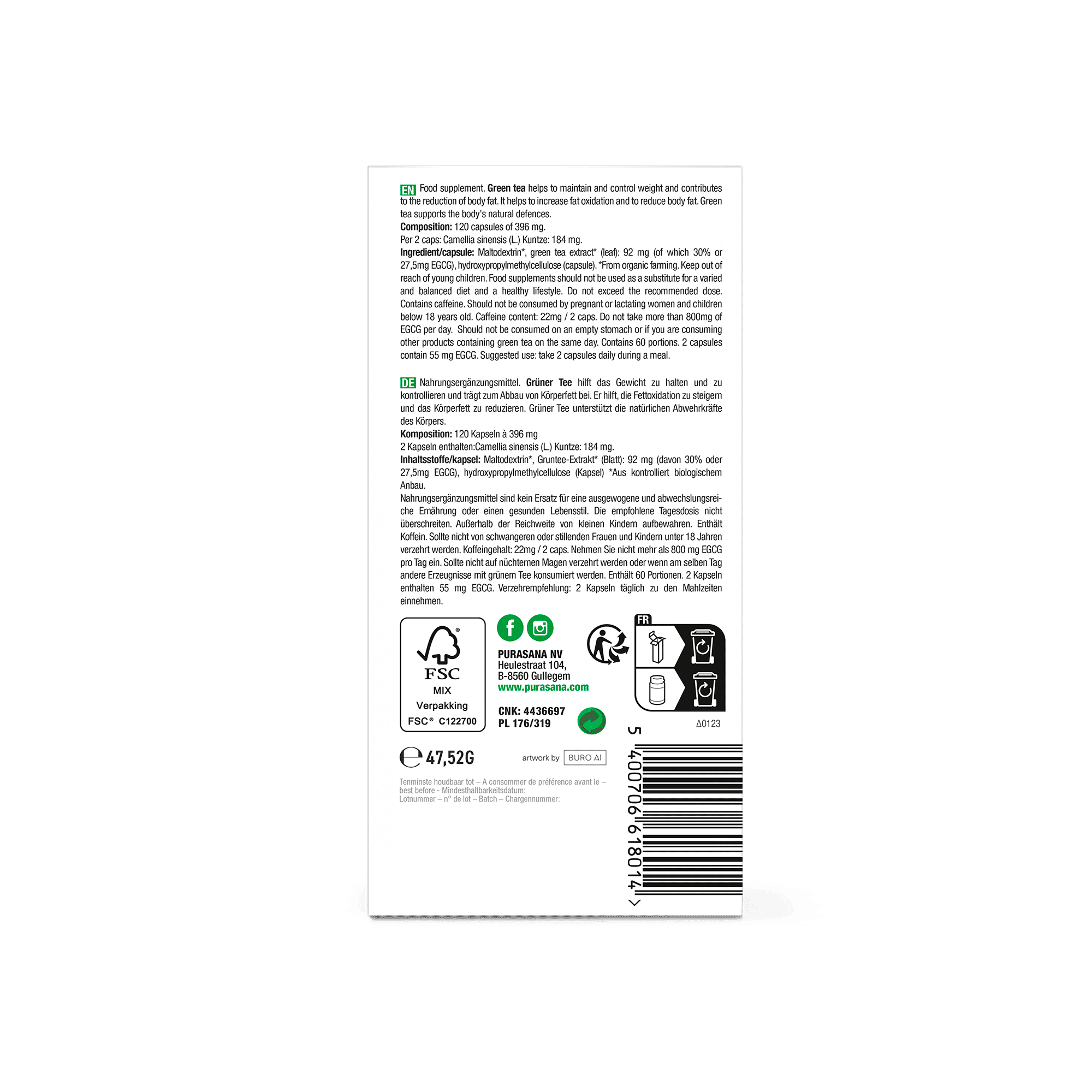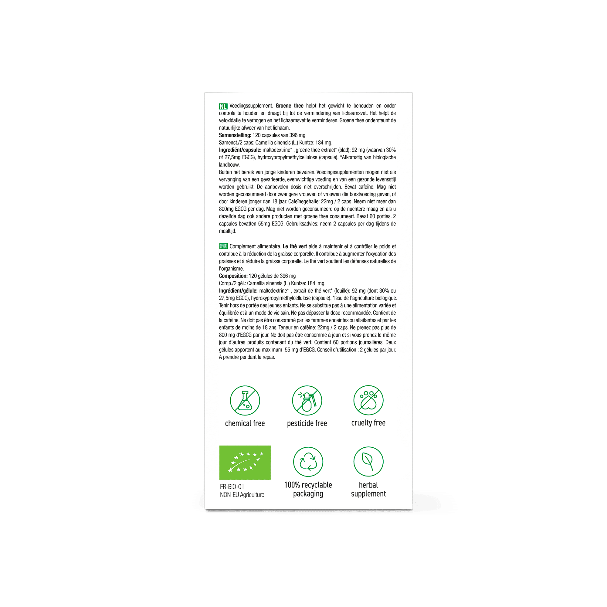 Groene thee extract* (blad), maltodextrine*, capsule: vegetarische capsule (hydroxypropylmethylcellulose).