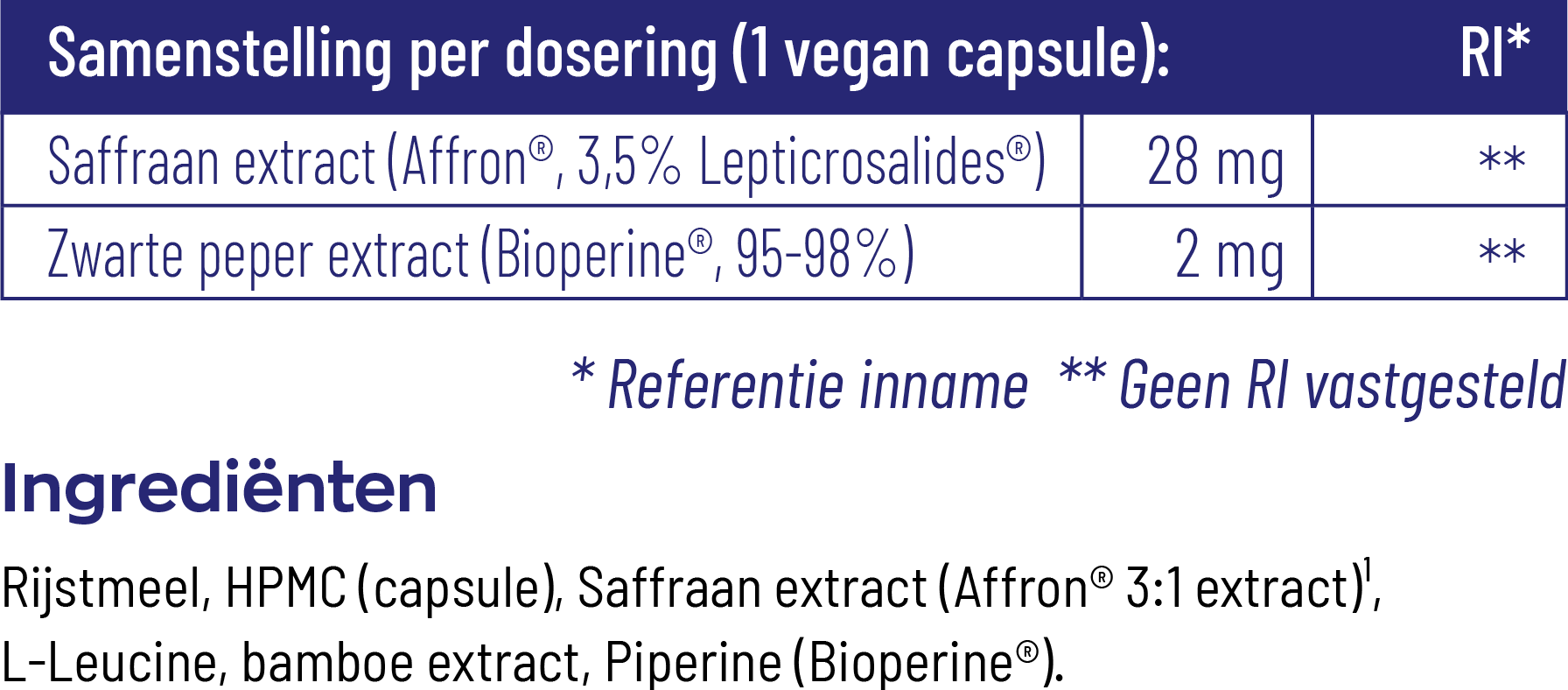 Rijstmeel, HPMC (capsule), Saffraan extract (Affron® 3:1 extract), L-Leucine, bamboe extract, Piperine (Bioperine®).