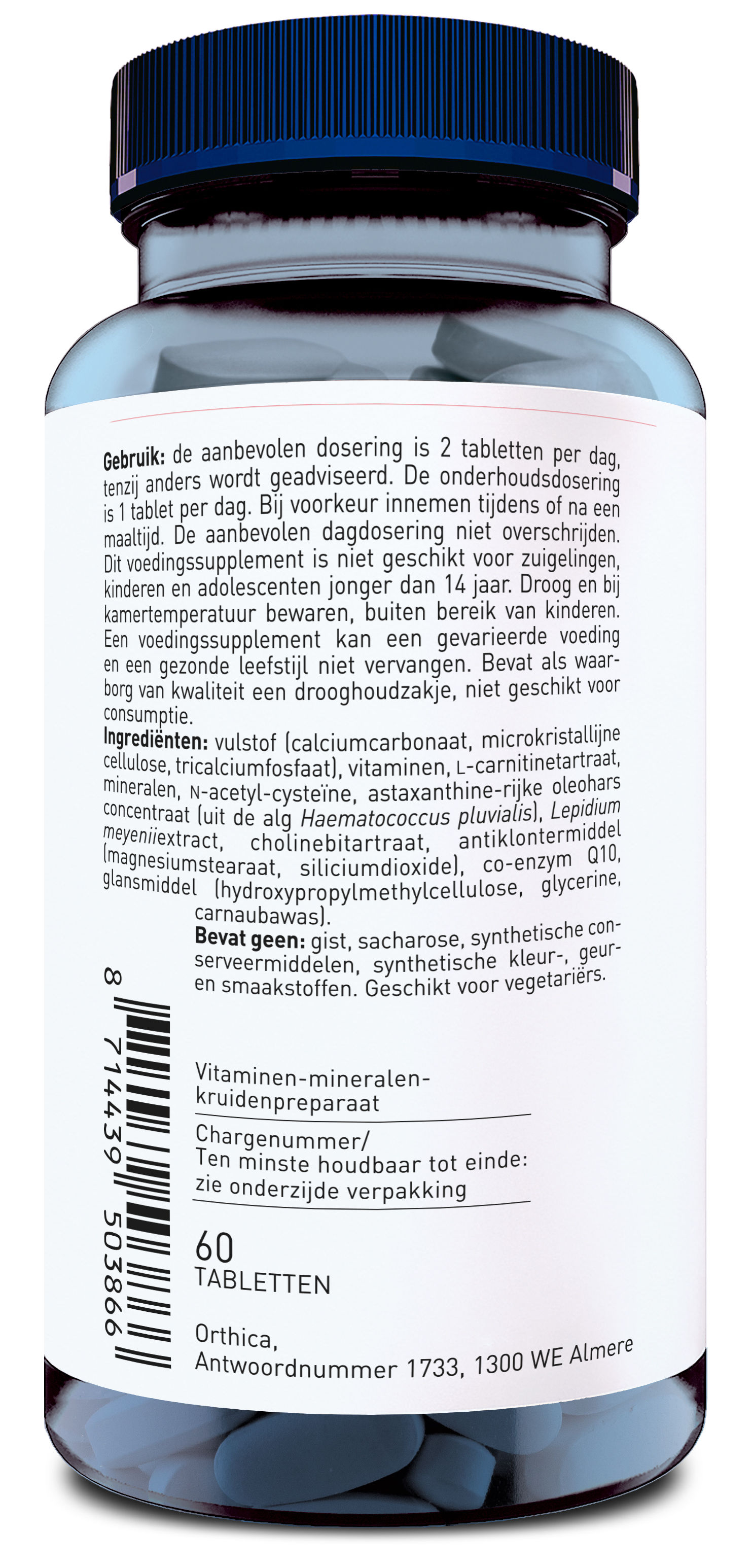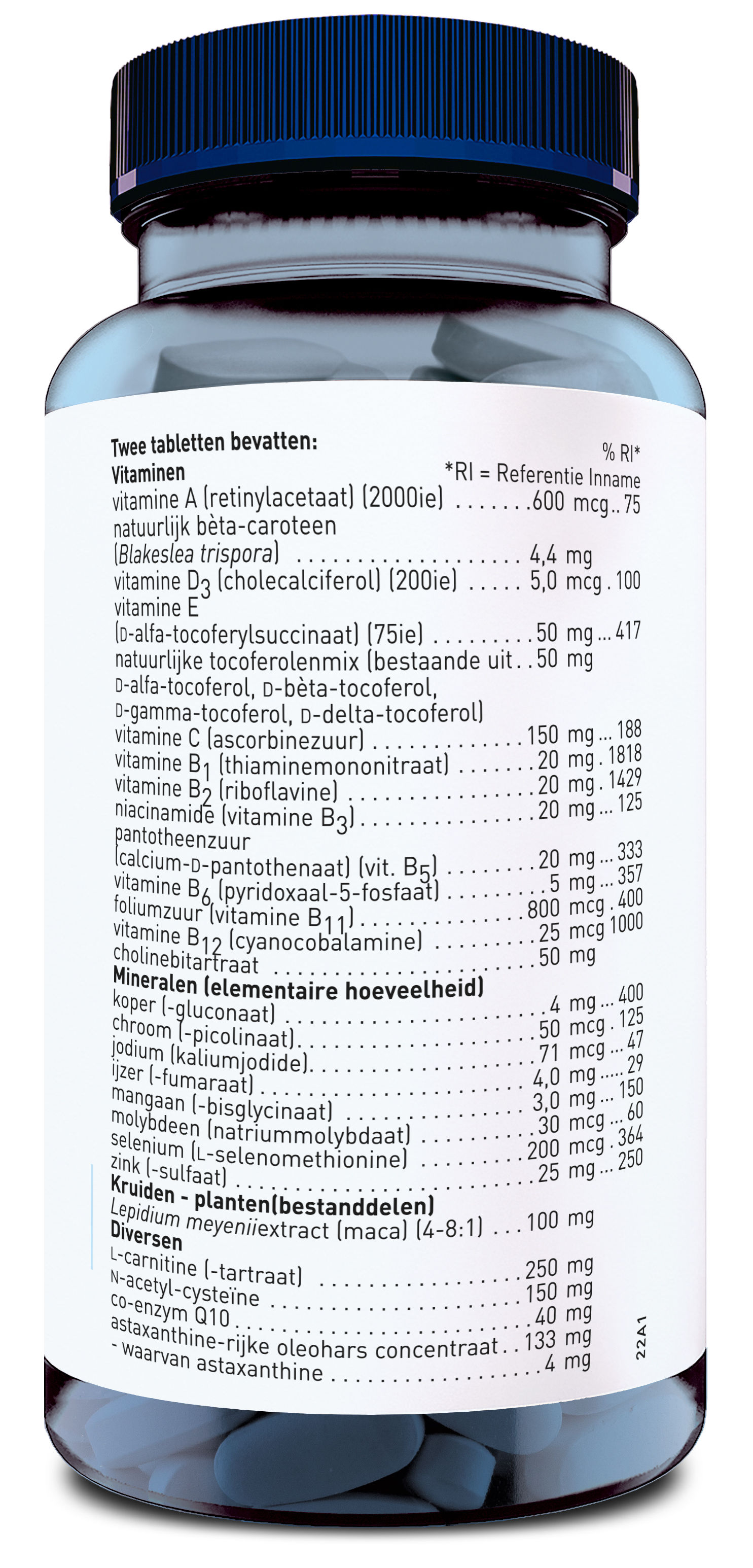 Vulstof (calciumcarbonaat, microkristallijne cellulose, tricalciumfosfaat), vitaminen, L-carnitinetartraat, mineralen, N-acetyl-cysteine, astaxanthine-rijke oleohars concentraat (uit de als haemotococcus pluvialis), lepidium meyenniiextract, siliciumdioxide), co-enzym Q10, glansmiddel (hydroxypropylmethylcellulose, glycerine, carnaubawas).
