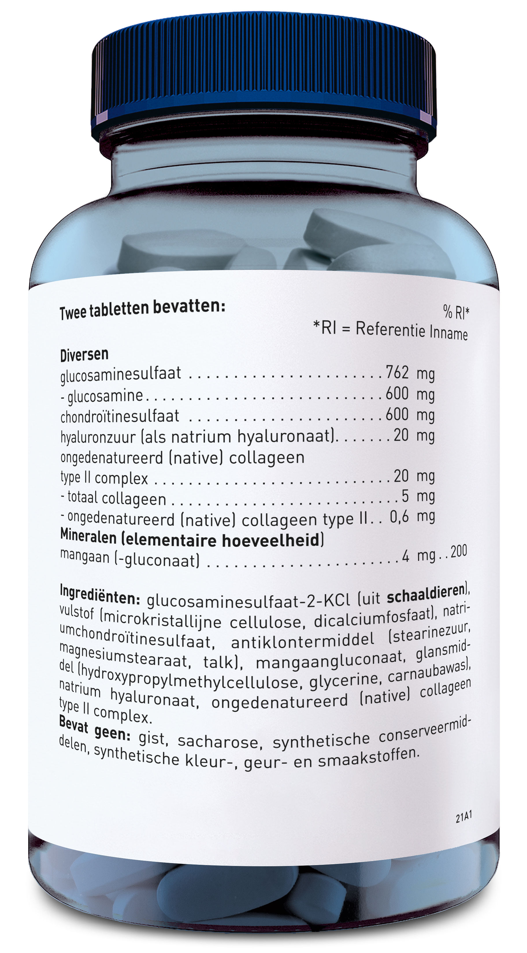 Glucosaminesulfaat-2-KCl (uit SCHAALDIEREN), vulstof (microkristallijne cellulose, dicalciumfosfaat), natriumchondroitinesulfaat, antiklontermiddel (stearinezuur, magnesiumstearaat, talk), mangaangluconaat, glansmiddel (hydroxypropylmethylcellulose, glycerine, carnaubawas), natrium hyaluronaat, ongedenatureerd (native) collageen type II complex