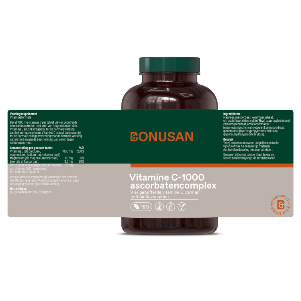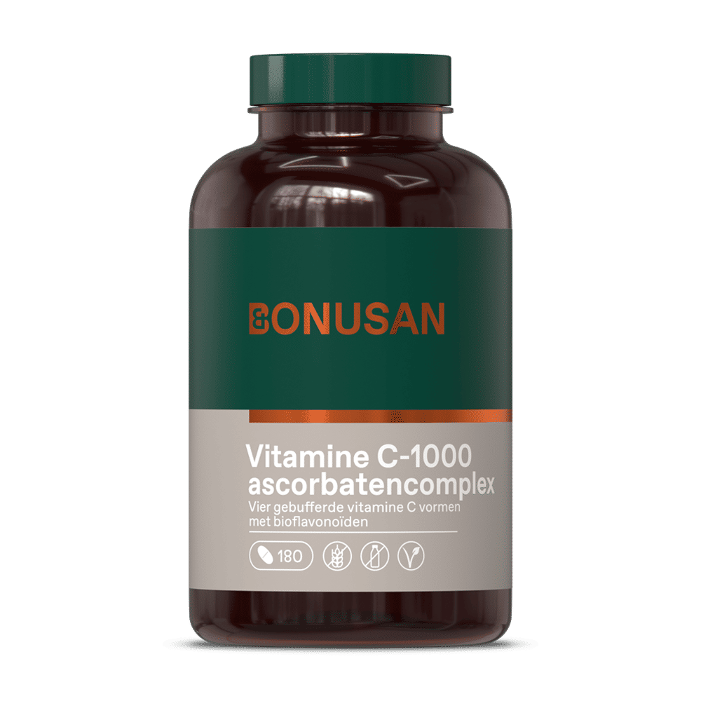 Bonusan Vitamine C-1000 ascorbatencomplex bevat per tablet 1000 mg ontzuurde vitamine C. Deze zogenaamde gebufferde vitamine C is milder voor tanden en maagwand. Bij een ascorbatencomplex is de vitamine C in het product gebonden aan mineralen.