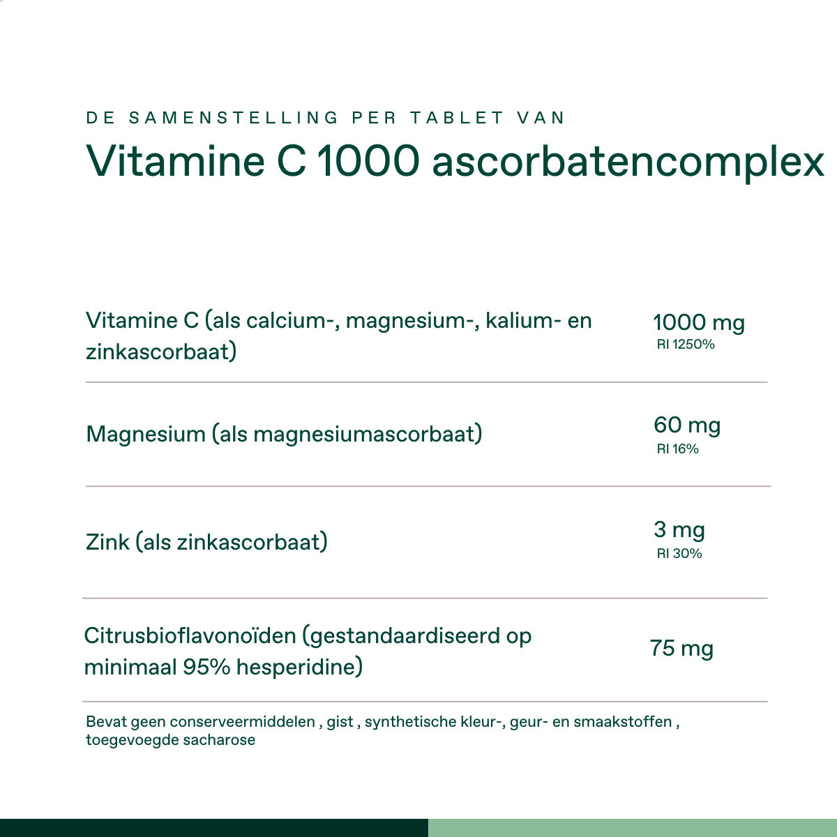 Magnesiumascorbaat, kaliumascorbaat, citrusbioflavonoïden, vulstof (HPC (cellulose)), calciumascorbaat, zinkascorbaat, antiklontermiddel (magnesiumstearaat), glansmiddel (HPMC , MCT-olie).