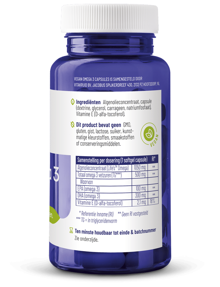 De Vegan Omega-3 capsules is een natuurproduct, wat betekent dat hoeveelheden DHA en EPA kunnen variëren. We garanderen echter wel een totale hoeveelheid van 500 mg omega 3, en een minimum van 100 mg EPA en 300 mg DHA per capsule.