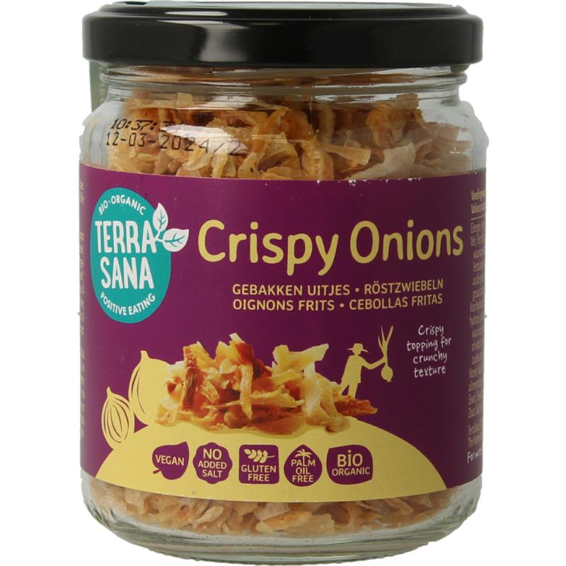 Gebakken uitjes. Lekker knapperige in zonnebloemolie gebakken uitjes, zonder zout toegevoegd en glutenvrij.