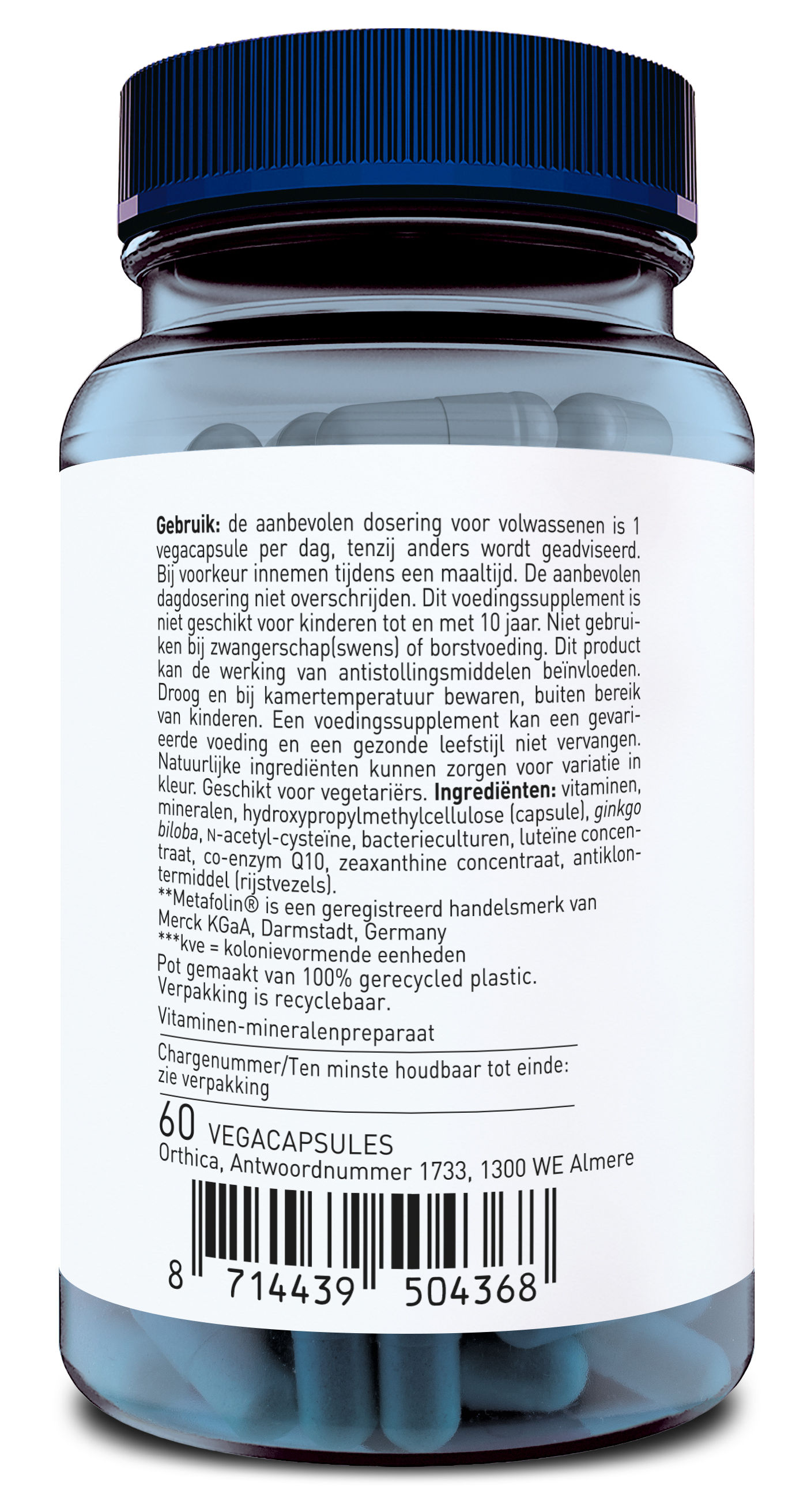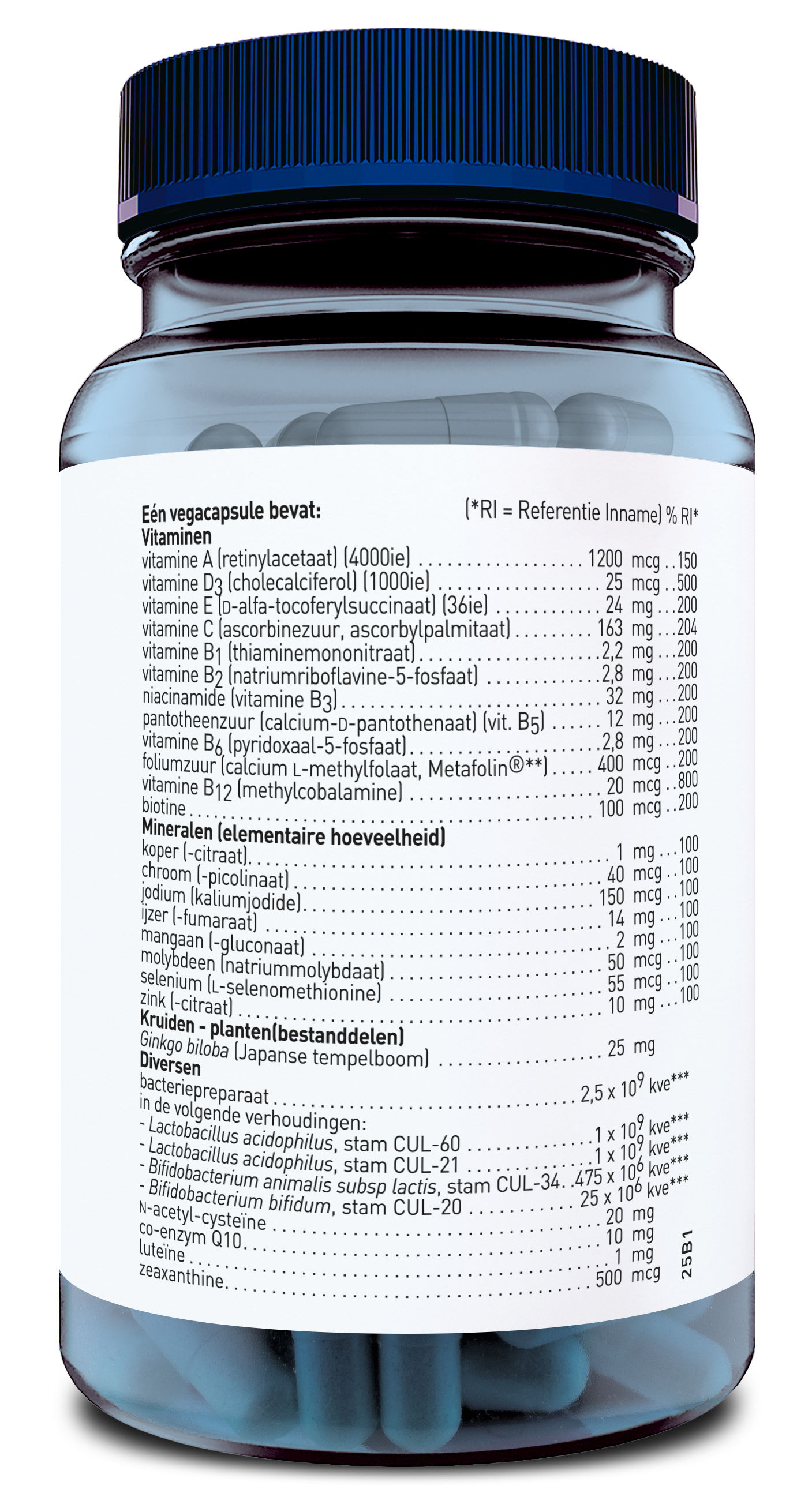 vitaminen, mineralen, hydroxypropylmethylcellulose (capsule), ginkgo biloba, N-acetyl-cysteïne, bacterieculturen, luteïne concentraat, co-enzym Q10, alfa-liponzuur, zeaxanthine concentraat, vulstof (rijst concentraat).