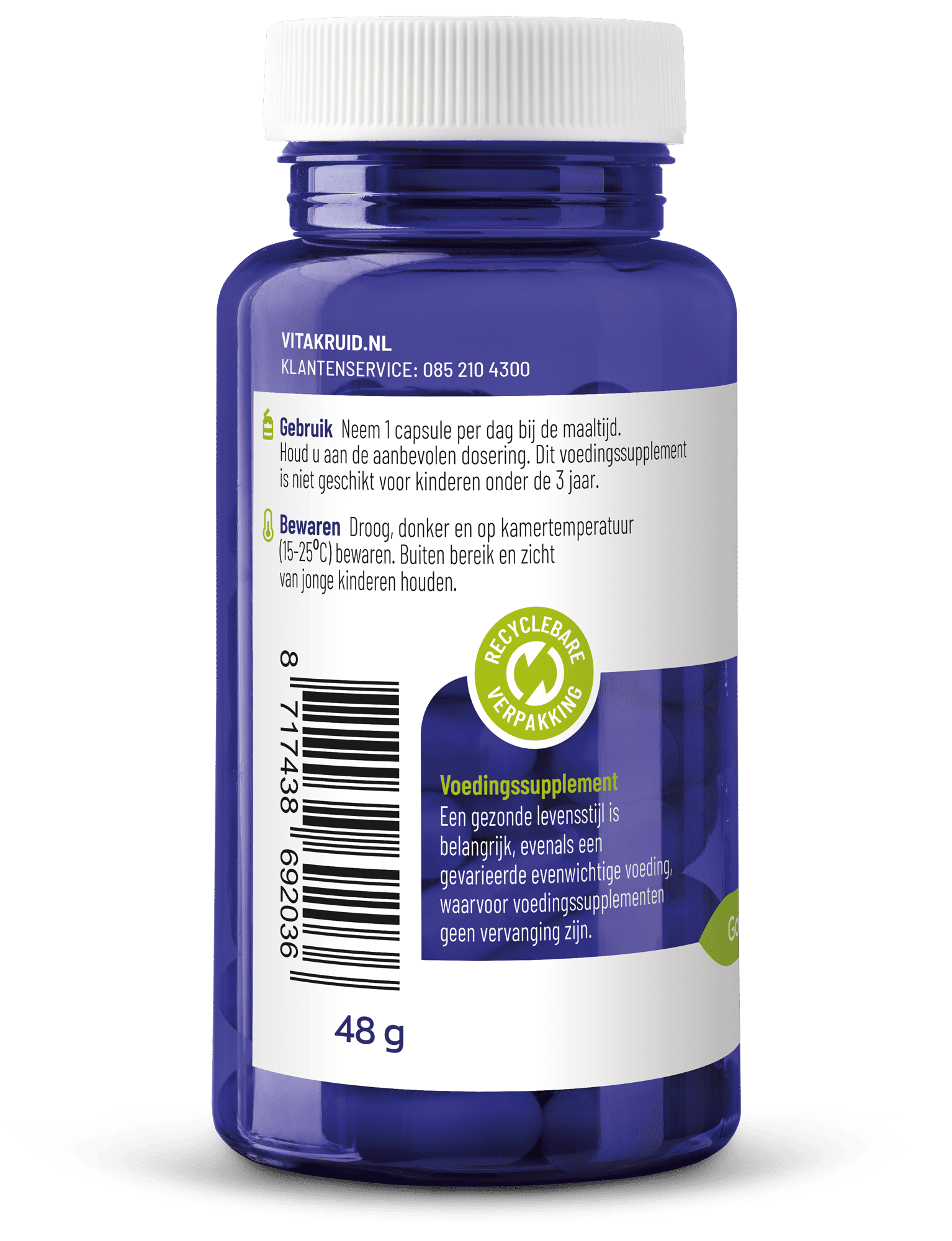 Een gevarieerde, evenwichtige voeding en een gezonde levensstijl zijn belangrijk. Een voedingssupplement is geen vervanging van een gevarieerde voeding.